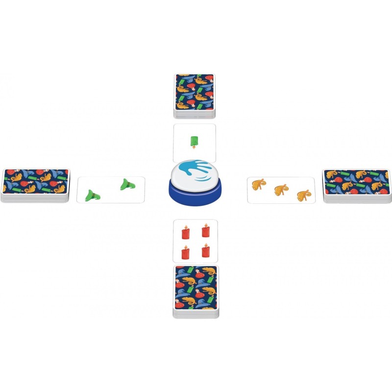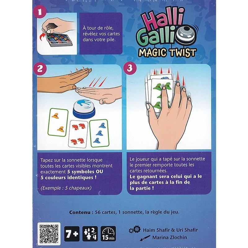Dans Halli Galli Magic Twist, retournez vos cartes chacun votre tour, et soyez le plus rapide à taper sur la sonnette dès qu'exactement 5 symboles ou 5 couleurs identiques apparaissent. Vous ramassez alors toutes les cartes retournées. Celui qui a le plus de cartes à la fin de la partie remporte la victoire!