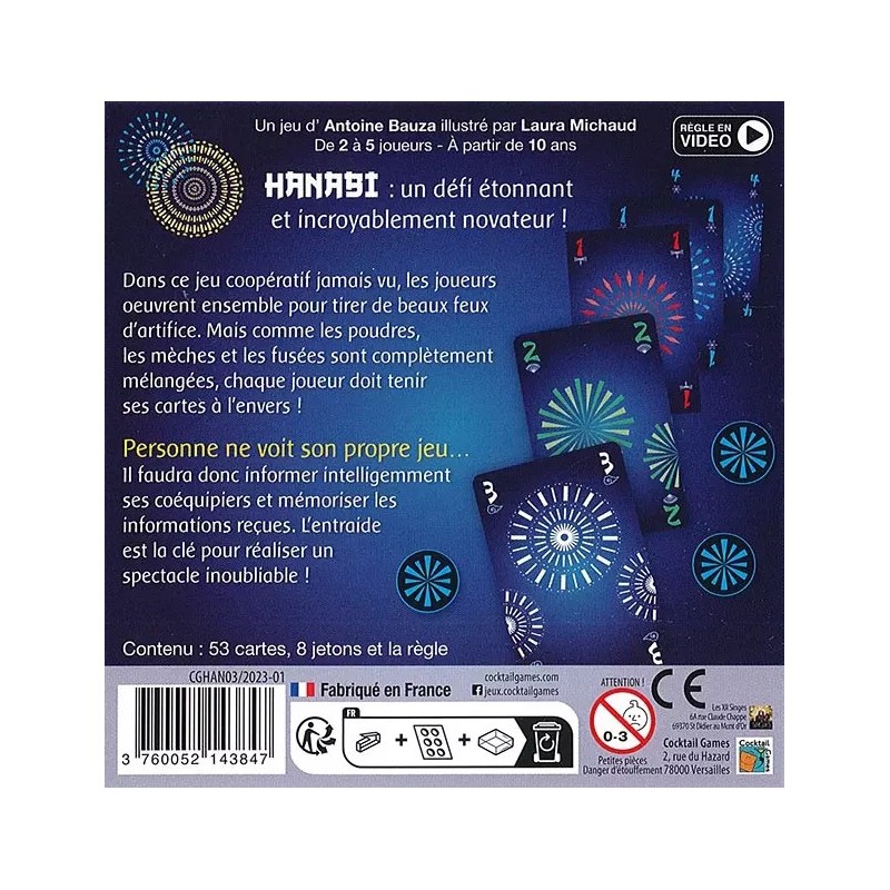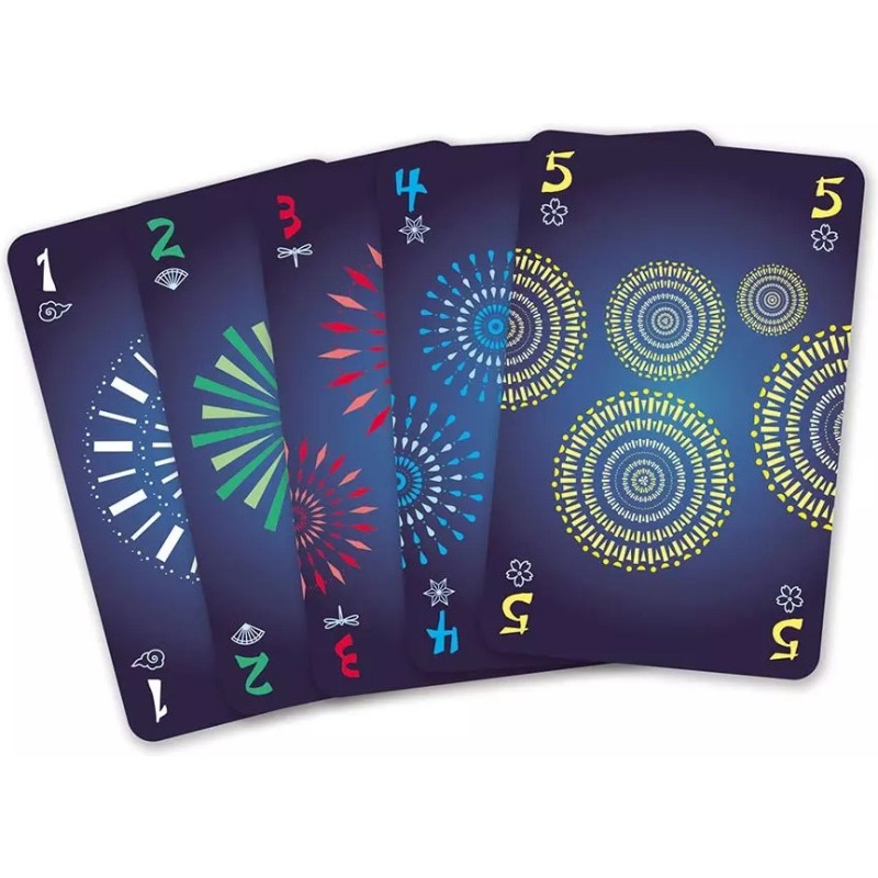 Les joueurs œuvrent ensemble pour tirer de beaux feux d’artifice en réalisant des suites de cartes de couleur. Mais les cartes sont tenues à l’envers ! Personne ne voit son propre jeu… Il faut donc informer intelligemment ses coéquipiers et mémoriser les informations reçues pour réaliser un spectacle inoubliable. Points-clés :
