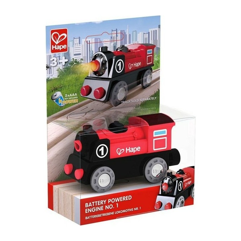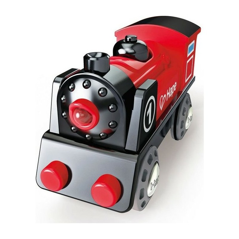 La locomotive électrique n°1 Hape Toys fonctionne à piles (non fournies), et chemine en éclairant les rails avec sa lampe frontale. Cette locomotive rouge a fière allure et elle est parfaite pour compléter un circuit de train en bois. Elle circule dans les deux sens, pour cela il suffit d’appuyer sur le bouton pour inverser le sens de circulation du train. Elle convient aux enfants à partir de 3 ans.