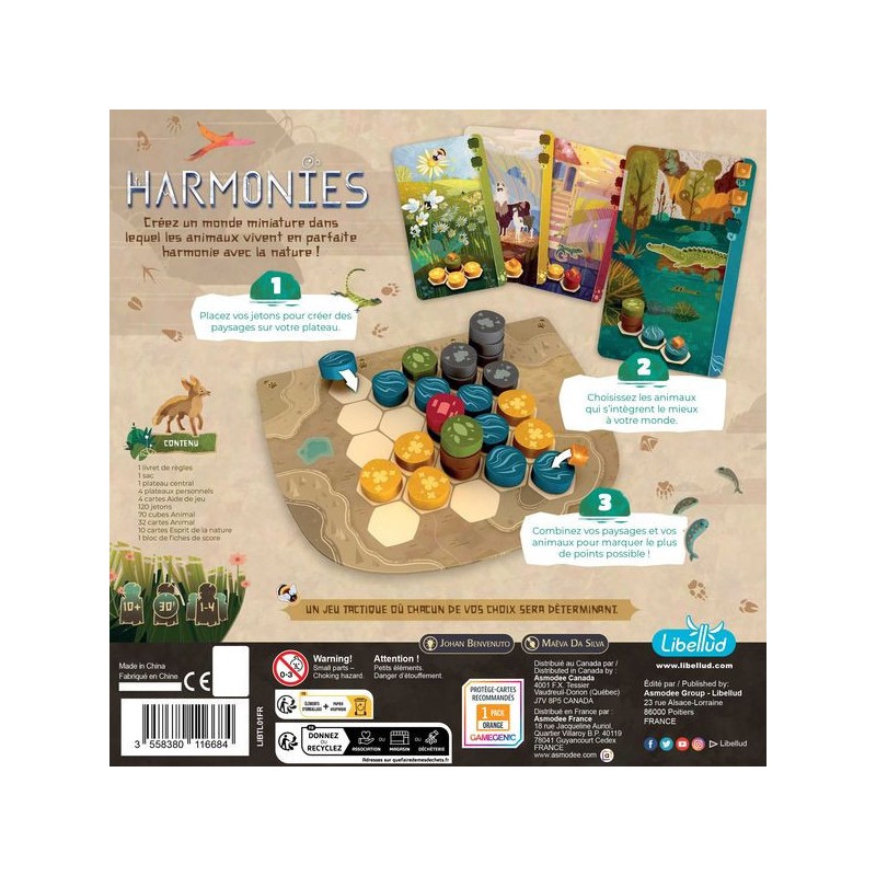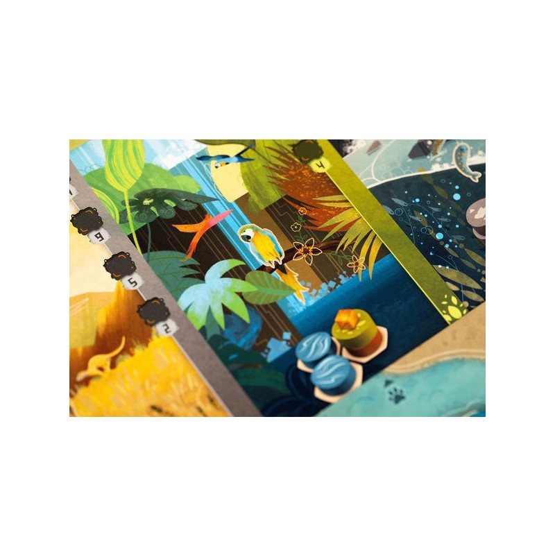 Construisez un paysage sur votre plateau en posant des séries de 3 pions et faites apparaitre des forêts, des montagnes, des champs et des villes. Sélectionnez ensuite les bonnes cartes Animal et reproduisez leur habitats pour qu’ils viennent peupler votre région. Qui obtiendra la plus belle faune ?