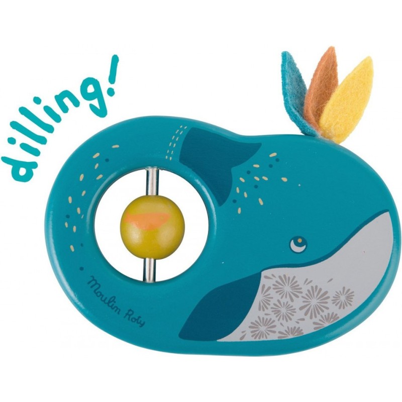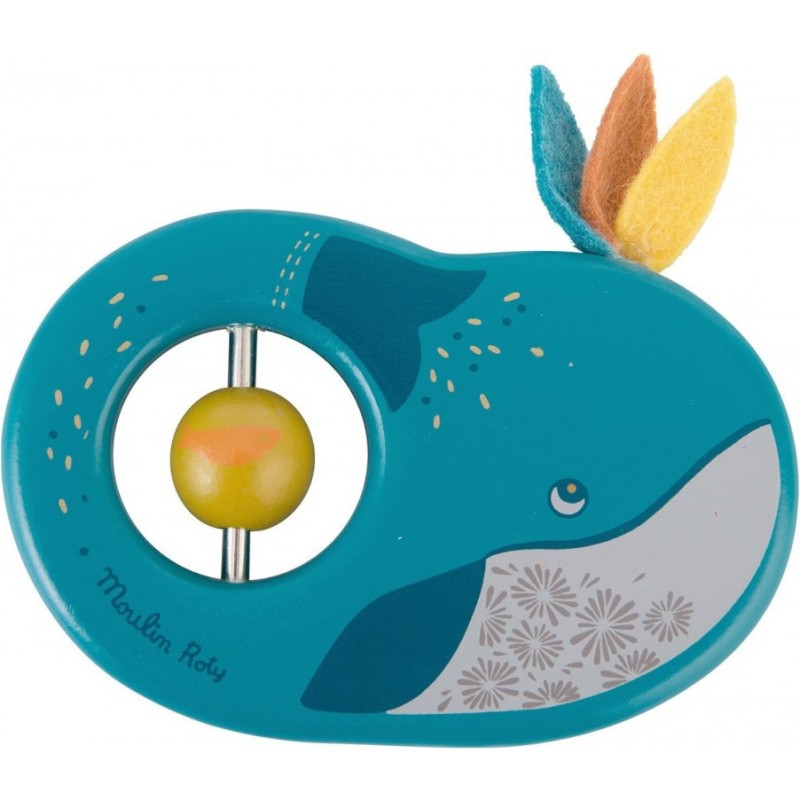 Hochet baleine en bois peint aux couleurs tendres, comporte une perle qui bouge le long d'un axe en métal, et de plumes colorées en bois sur sa tête. Idéal pour l'éveil de bébé et pour développer sa capacité à saisir un objet. Olga l’oie et ses petits entament un grand voyage...
