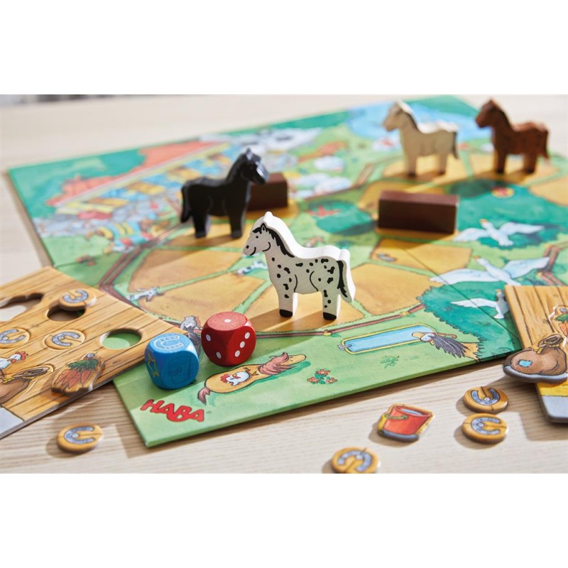 Hop ! Hop ! Des galopons ! Aide à comprendre la première règle du jeu. Hop ! Des galopons ! By Haba est l'un des chevaux les plus populaires pour les jeunes amateurs de chevaux. Après une agréable journée dans la prairie, les chevaux sont maintenant prêts à partir. Il est temps de retourner à l'écurie. Il y a encore d'autres choses qui n'ont pas été trouvées dans les boîtes. Il s'agit notamment de carottes et d'un sac rempli d'avoine. Avant que leur cheval ne puisse atteindre l'écurie, les joueurs doivent collecter divers objets. Deux dés indiquent le nombre de cases que le cheval peut parcourir ou les objets qui ne peuvent pas être récupérés. Avec un peu de chance, la personne qui choisit le bon dé pourra d'abord amener son cheval dans son box. La passionnante course de chevaux encourage la compréhension des règles et aide à la prise de décision. Vous devez choisir entre les deux options qui pèsent le pour et le contre. Hop ! Hop ! Des galopons ! Trois versions différentes de Haba sont disponibles.