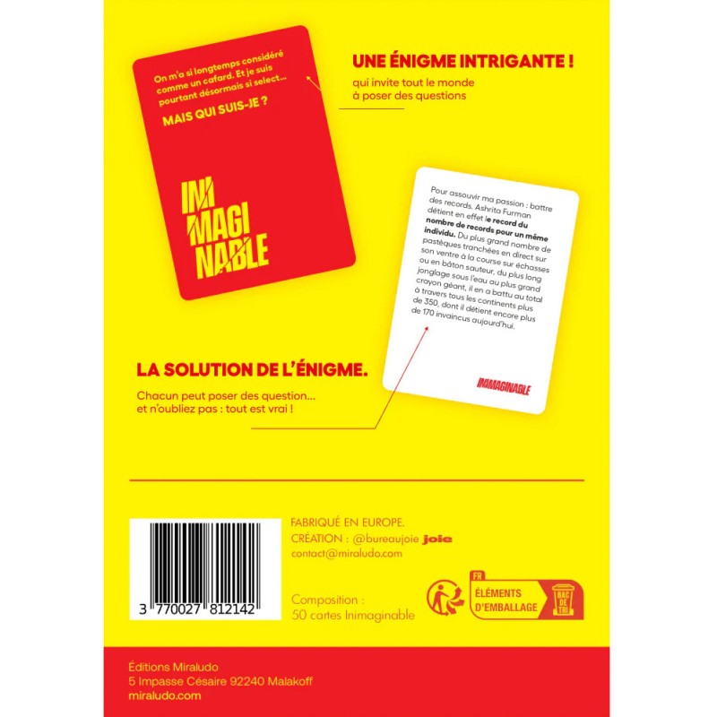 Dans Inimaginable, explorez des faits incroyables mais pourtant réels ! Chaque carte présente une énigme surprenante, et les joueurs doivent poser des questions fermées (oui/non) pour en découvrir l’explication.