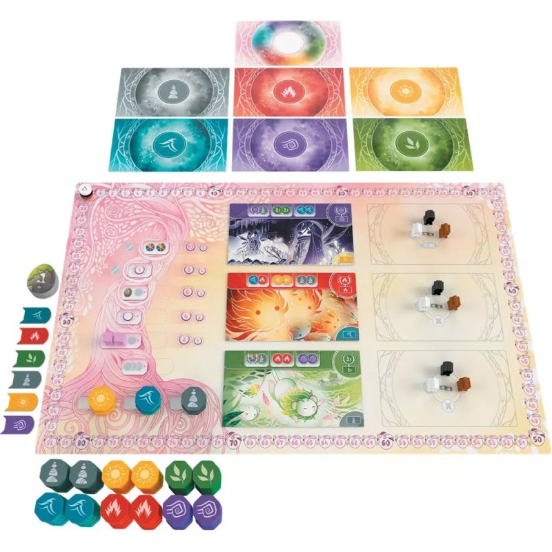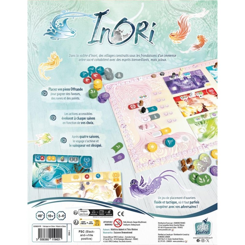 Dans la vallée d’Inori, les villages sont construits sous un immense arbre sacré dans lequel vivent des esprits. Toute l’année, les chefs des villages font des offrandes aux esprits et dressent des autels en espérant de devenir le Gardien du Grand Arbre pour l’année suivante. Durant chacune des 4 saisons que dure la partie, les joueurs placent leurs marqueurs Offrande sur les cartes Esprit ou sur les autels du Grand Arbre. Ceci permet d’activer des capacités, de gagner des points de victoire, de recevoir des pions Faveur. À l’issue d’une saison, les cartes Esprit dont tous les emplacements ont été remplis rapportent des points supplémentaires et sont remplacées par de nouvelles cartes, offrant d’autres possibilités. À la fin de la partie, ce sont les offrandes placées sur l’arbre et leur couleur qui offre un gain de points, en fonction des joueurs ayant le plus de faveurs de chaque couleur. Le gardien de l’année suivante est le joueur ayant le meilleur score.