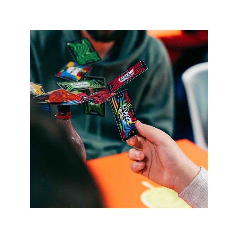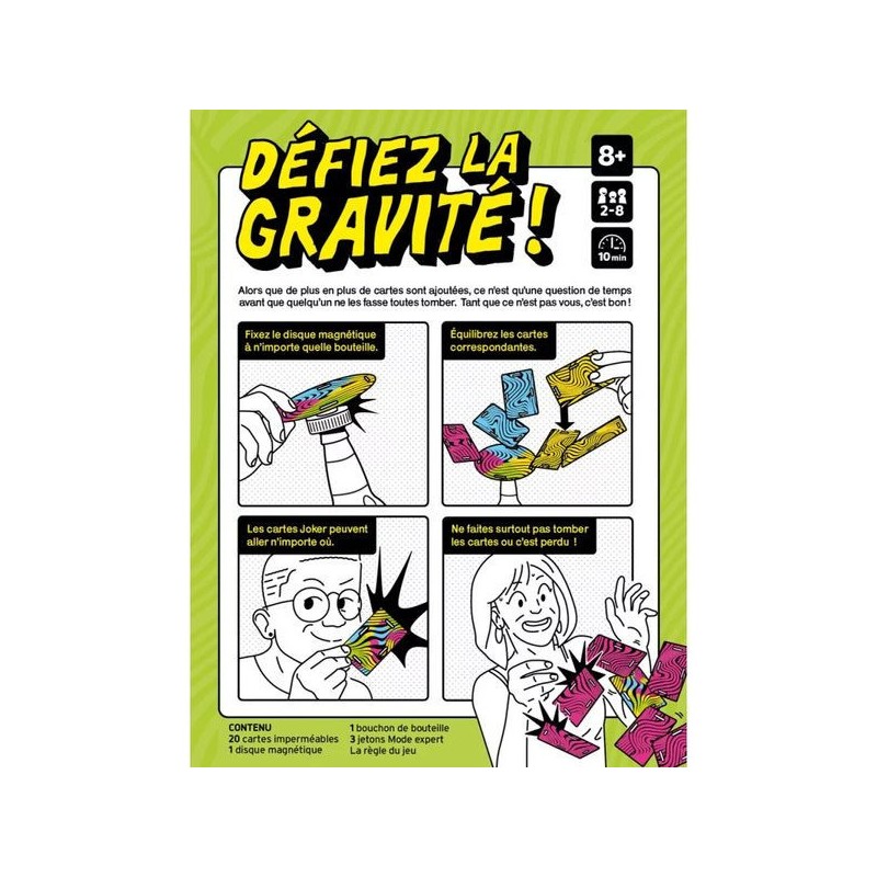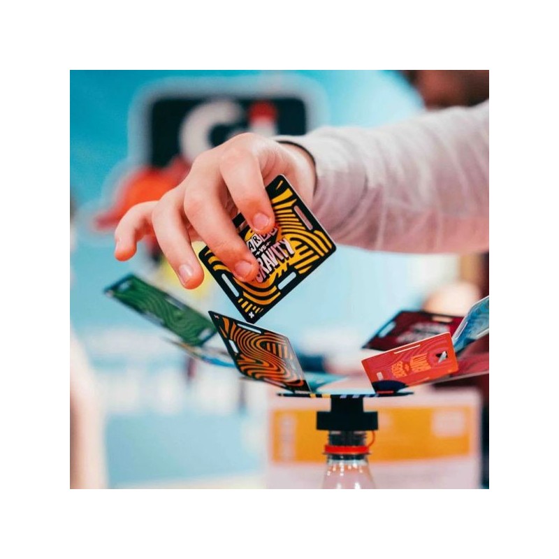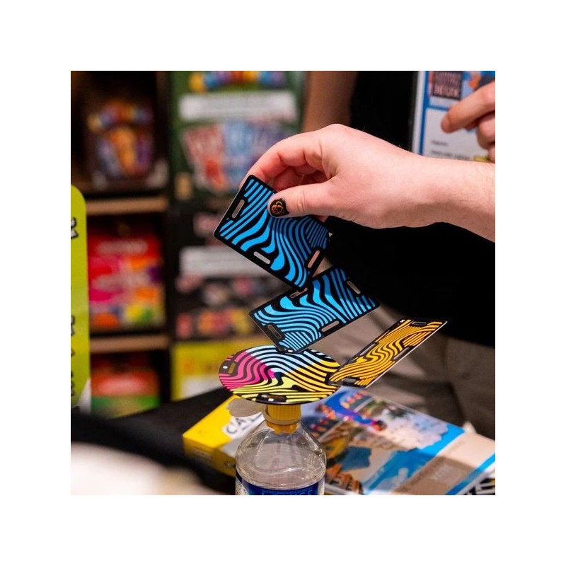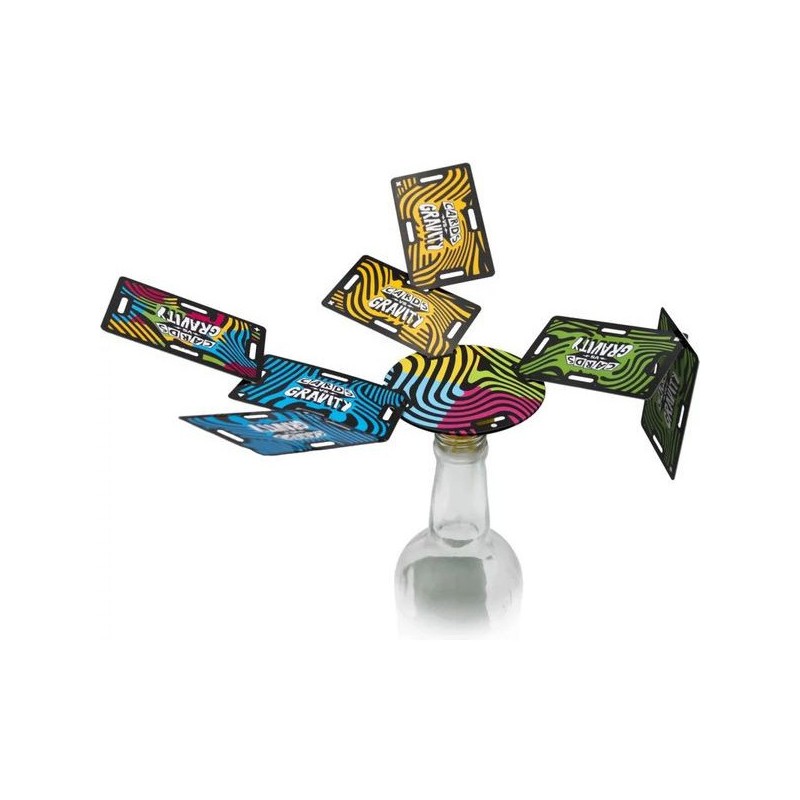 Il suffit de fixer la base magnétique sur n'importe quelle bouteille, puis d'équilibrer les cartes à tour de rôle. Si vous vous débarrassez de toutes vos cartes, vous êtes en sécurité... pour l'instant. Mais la gravité finira par vous rattraper ! Quelqu’un finira par renverser toutes les cartes, alors assurez-vous que ça ne soit pas vous !