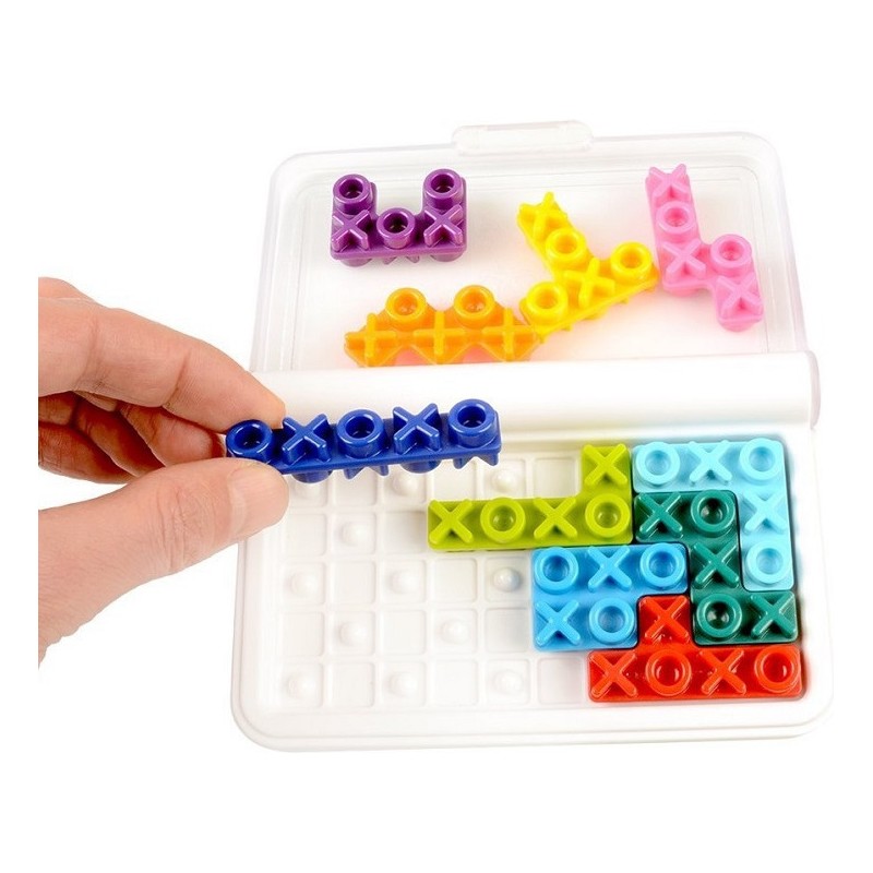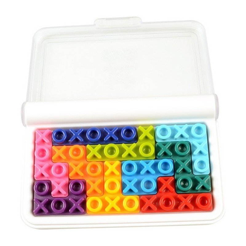 Contenu : 1 coffret de jeu et rangement, 10 pièces de couleur de X et O recto Verso, 1 livret de règles contenant 120 défis et leur soluton.