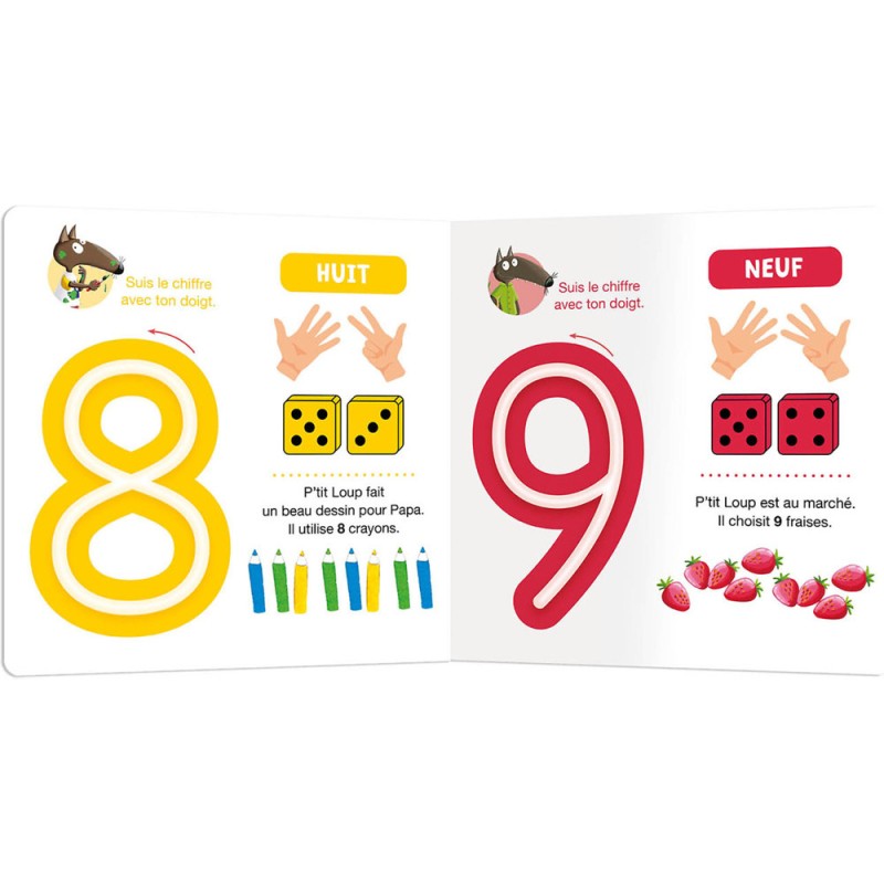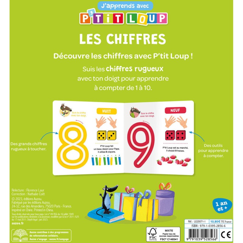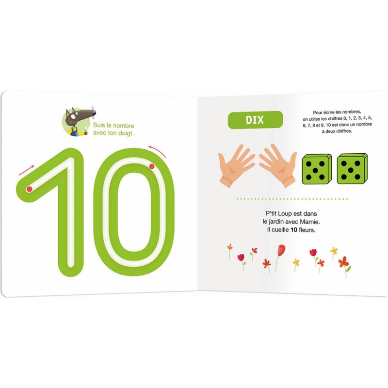 Un grand album tout carton pour découvrir les chiffres de 1 à 10 ! Une nouvelle notion pour les tout-petits, à découvrir avec P’tit Loup. Sur chaque page le lecteur découvre un chiffre et toutes les manières de le représenter, ainsi qu’un grand chiffre recouvert de vernis rugueux pour que l’enfant puisse suivre le tracé avec son doigt et ainsi appréhender le geste d’écriture.