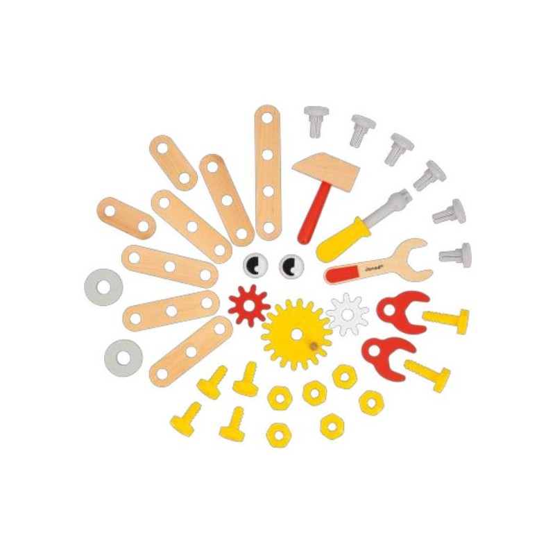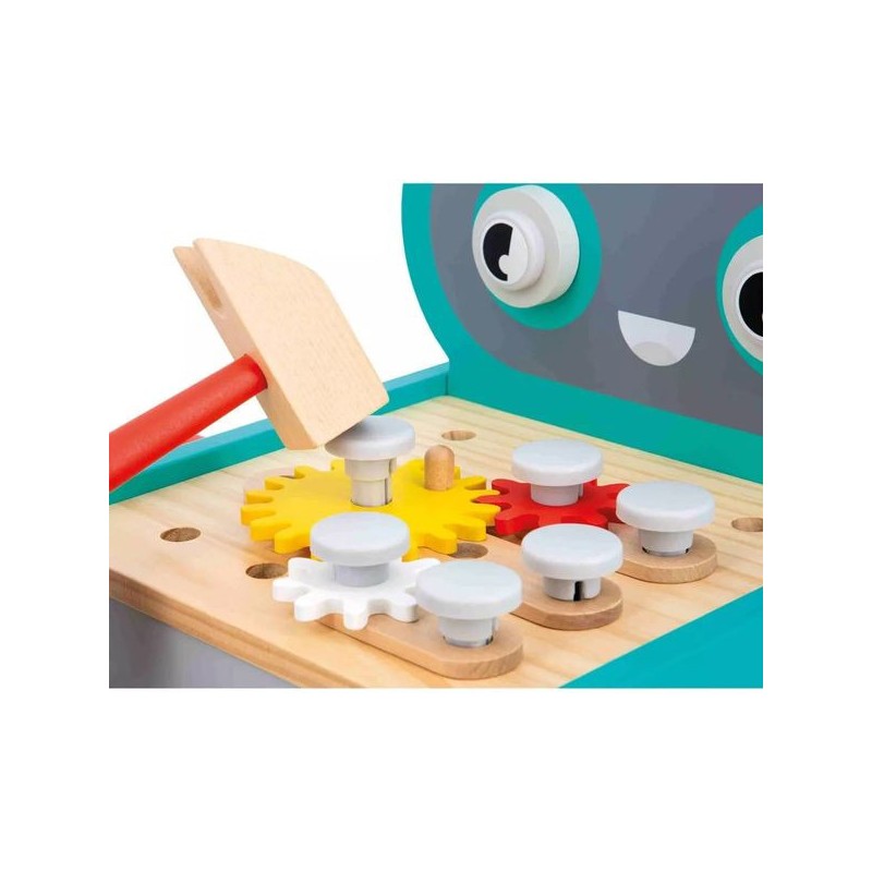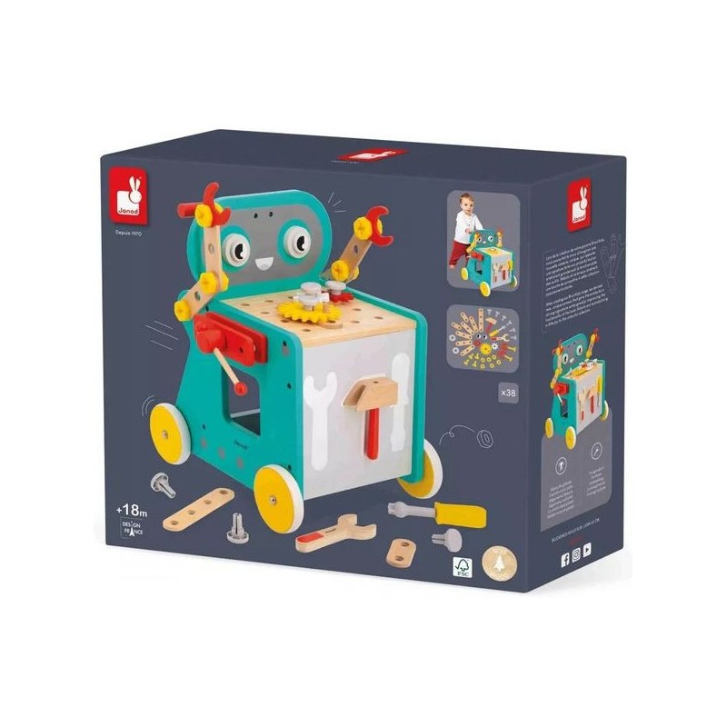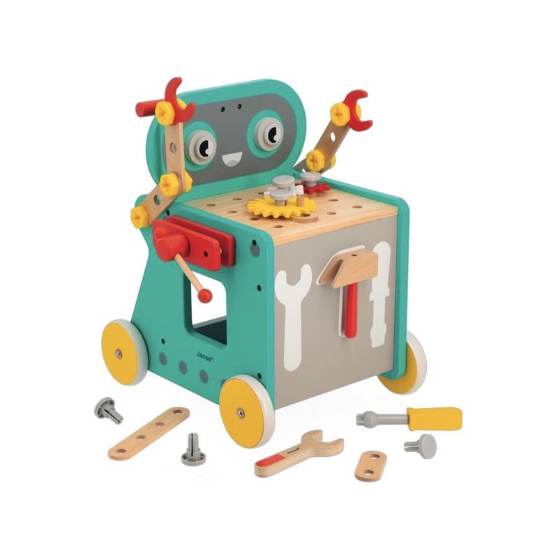 Aussi pratique pour bricoler qu'à faire rouler. 38 accessoires de bricolages complètent ce chariot magnétique pour bébé : 18 accessoires en bois (plaquettes et engrenages), 20 accessoires en plastique (vis, écrous, clous). Le petit plus : les vis sont équipées de crans pour toujours plus de réalisme. L'autre atout de ce jouet premier âge, ce sont les bras du robot à assembler et à articuler de part et d'autre du chariot : il prend vie et devient un véritable compagnon de jeu pour votre tout-petit.