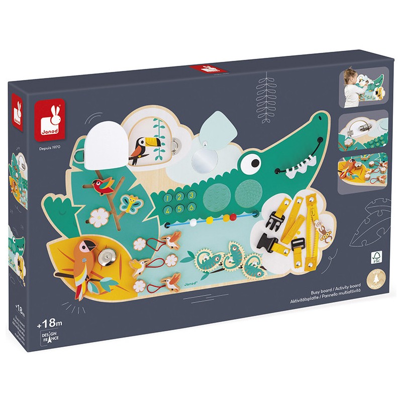 Il saura trouver sa place dans une chambre d’enfant, grâce à son style tropical et ses couleurs vives. Bébé retrouvera tous les animaux stars de la jungle : toucan, perroquets, singe … Et le crocodile, bien sûr ! . Issu de notre collection de jouets d’éveil en bois Tropik, ce busy-board crocodile est composée de bois certifié Fsc™.