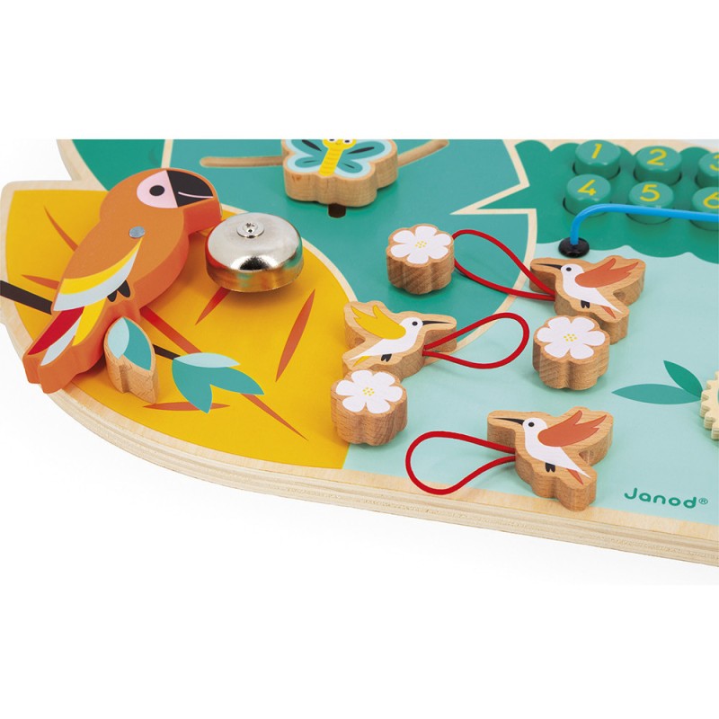 Au programme des réjouissances : 1 labyrinthe avec 3 éléments à manipuler, 1 œil rotatif sonore, 3 sangles avec différents systèmes de fermeture (fermeture éclair, scratch, plastique), 3 engrenages caméléons, 1 sonnette, 1 serrure métallique, 1 miroir caché, 1 boulier avec des billes colorées, des textures en silicone et en feutrine à toucher, des boutons à pousser, des élastiques à attacher … Vous l’aurez compris, ce sont des heures de découvertes qui s’offrent aux petits curieux !