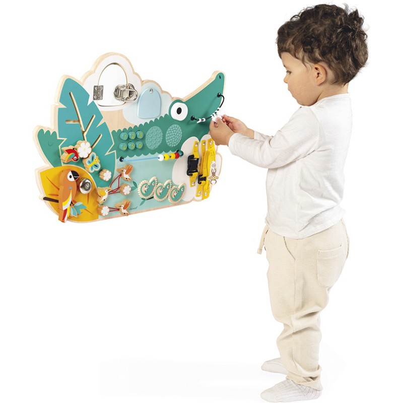 Un busy-board tout droit sortie de la jungle pour la chambre de bébé ! Idéale pour divertir et stimuler les petits, dès 18 mois, cette planche d’activités en forme de crocodile propose une multitude de jeux à manipuler. Au total, plus de 14 jeux d’éveil sont répartis sur ce panneau d’activités, pour favoriser le développement de la motricité et de la dextérité des enfants.