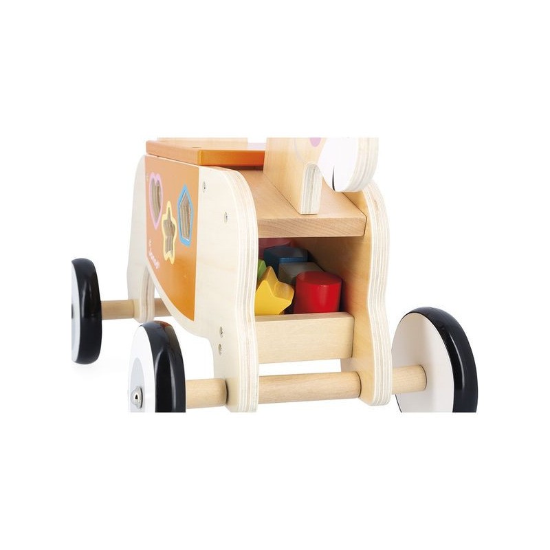 Le petit plus de ce jouet d’éveil ? La boîte à formes incluse, avec 6 formes à encastrer et à récupérer à l’avant, pour mieux recommencer. Parfait pour exercer sa dextérité ! Enfin, les 4 roues en caoutchouc sont silencieuses et assurent un bon maintien, pour des promenades en toute sérénité. Idéal pour encourager la motricité globale et renforcer ses appuis en vue de la marche, ce porteur en bois nous fait craquer avec ses petites oreilles en feutrine et ses couleurs tendres.