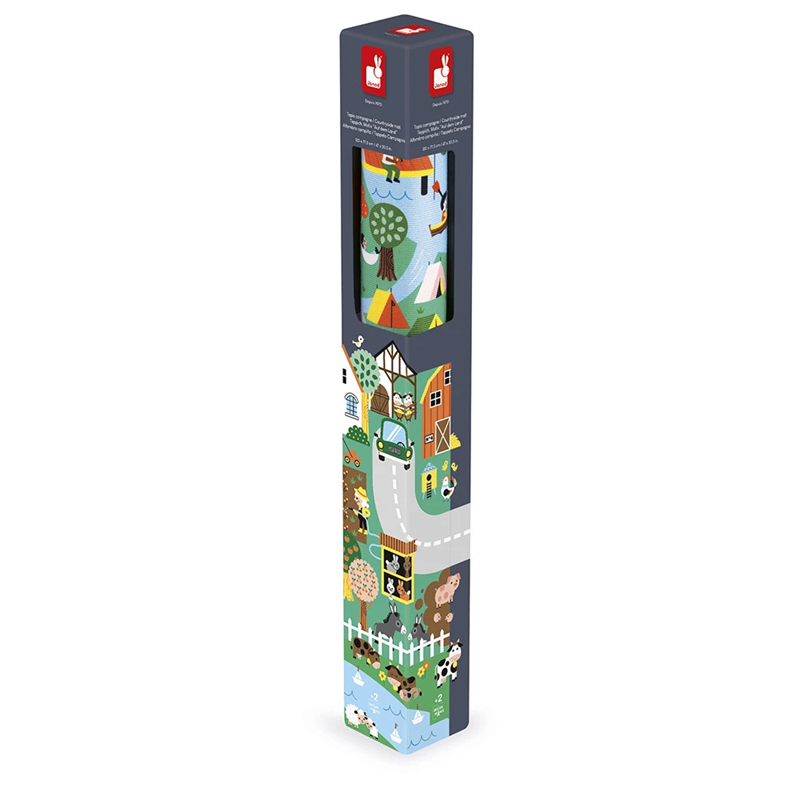 Ah, la campagne ! Dans ce décor bucolique et champêtre, on passe de la ferme à la forêt, et même par le centre équestre ! Ce tapis de jeu campagne convient aux enfants à partir de 2 ans. Il possède une large et longue route, pour prendre la clé des champs et imaginer des histoires à l’infini ! Sur leur tapis de jeu avec circuit, les petits s’amusent sur les routes sinueuses de campagne à la recherche d’éléments cachés, tel un cherche et trouve. On repère où se trouve le loup dans la forêt, le fermier dans son tracteur, et on s’amuse des petits canards qui traversent la rivière … Il y a tant de bâtiments, d’animaux et de personnages représentés ! On débute avec l’arrosage du potager, puis on file aider le berger à garder ses moutons, avant de se rendre au centre équestre pour une balade à cheval. Avec leur tapis de jeu en tissu, les enfants développent leur imagination et leur vocabulaire, mais aussi leur sens de l’observation. Les plus petits découvrent même les couleurs et les chiffres de 1 à 10 ! Autre atout de ce tapis de jeu pour enfant : il est antidérapant ! Parfait pour y faire rouler des petites voitures, ou tout simplement pour les petits qui ont la bougeotte. Dans son format 120 x 78 cm, ce tapis pour chambre d’enfant offre d’autres possibilités de jeu avec ses accessoires (vendus séparément) : il peut être complété d’une panoplie de véhicules et de cubes en bois, issus, eux aussi, de notre gamme Cross Roads. Vous pouvez également relier ce tapis ferme avec d’autres tapis de la collection, pour créer un espace de jeu géant et prolonger les aventures des enfants. En effet, les circuits sont conçus pour s’associer sur les 4 côtés du tapis. Et si on plantait la tente ce soir ?