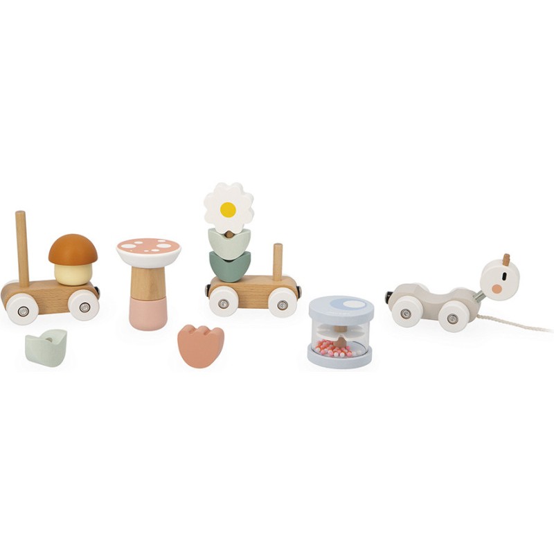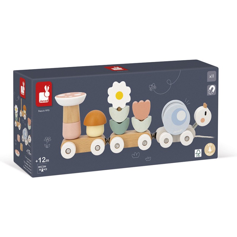 C’est dans l’univers frais et bucolique du jardin que bébé développe sa motricité fine et sa coordination, pour bien grandir. D’abord, on se familiarise avec les pièces et on les empile sur le train : 2 fleurs et 2 champignons sont à recomposer. Et puis, surprise : la coquille de l’escargot en tête de file n’est autre qu’un hochet à billes transparent !