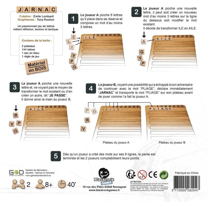 Jarnac est un duel de mots où chaque joueur devra constituer des mots de plus en plus longs afin de marquer un maximum de points, tout en évitant de s’en faire voler par son adversaire. Un passionnant jeu de lettres mêlant réflexion, tension et tactique... Chaque joueur commence la partie avec 6 lettres sur son plateau.