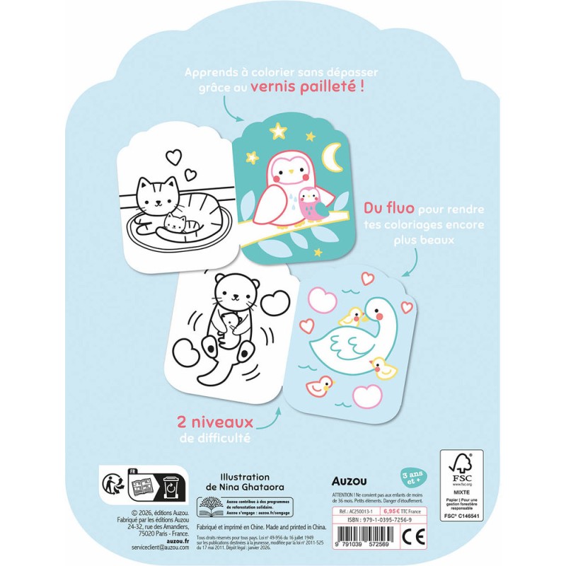 Découvre tes nouveaux coloriages fluos sur le thème des bébés animaux avec deux niveaux de difficulté : le premier niveau pour apprendre à bien colorier sans dépasser avec l'aide du vernis à paillettes et le deuxième niveau sans vernis à paillettes pour montrer tes talents !
