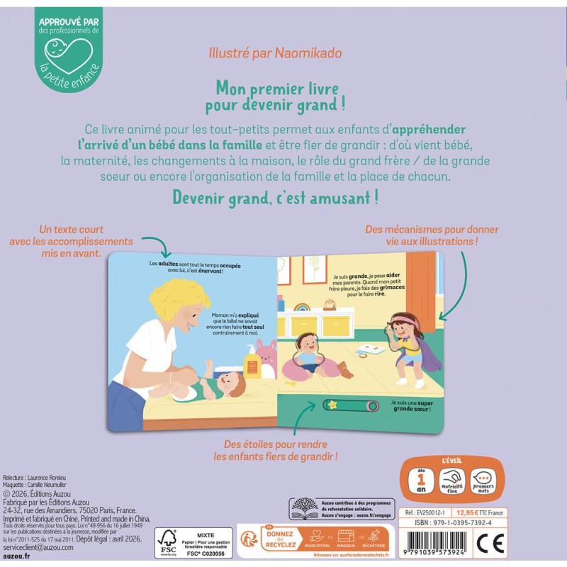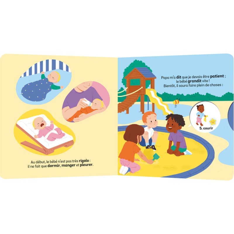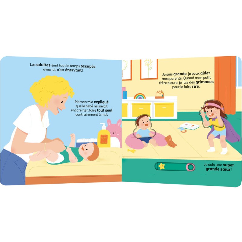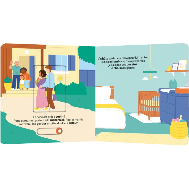 L’enfant découvre 10 rituels pour l'aider à appréhender l’arrivée de son petit frère ou de sa petite sœur, à travers des mécanismes simples à activer. Il découvre comment participer à la vie de bébé et trouver sa nouvelle place dans la famille.