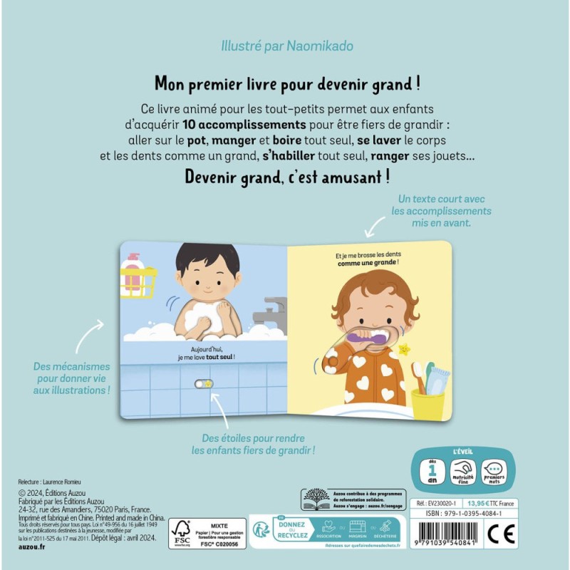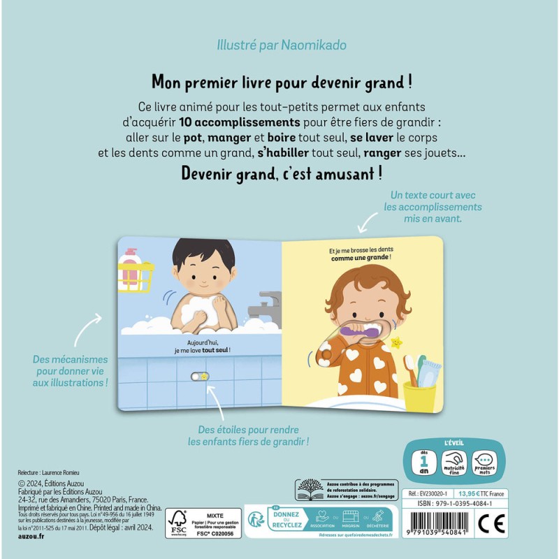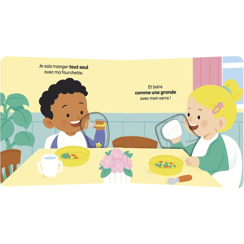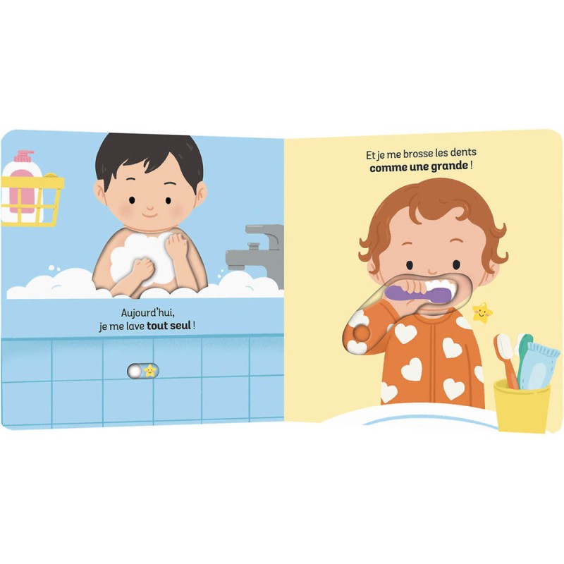 L’enfant découvre 10 rituels pour bien grandir, à travers des mécanismes simples à activer. Devenir grand, c’est amusant ! 10 accomplissements : Aller sur le pot Se laver tout seul Se brosser les dents Manger tout seul Boire tout seul S’habiller tout seul Arrêter la tétine Ranger tout seul Aller à l’école Dormir dans un lit de grand
