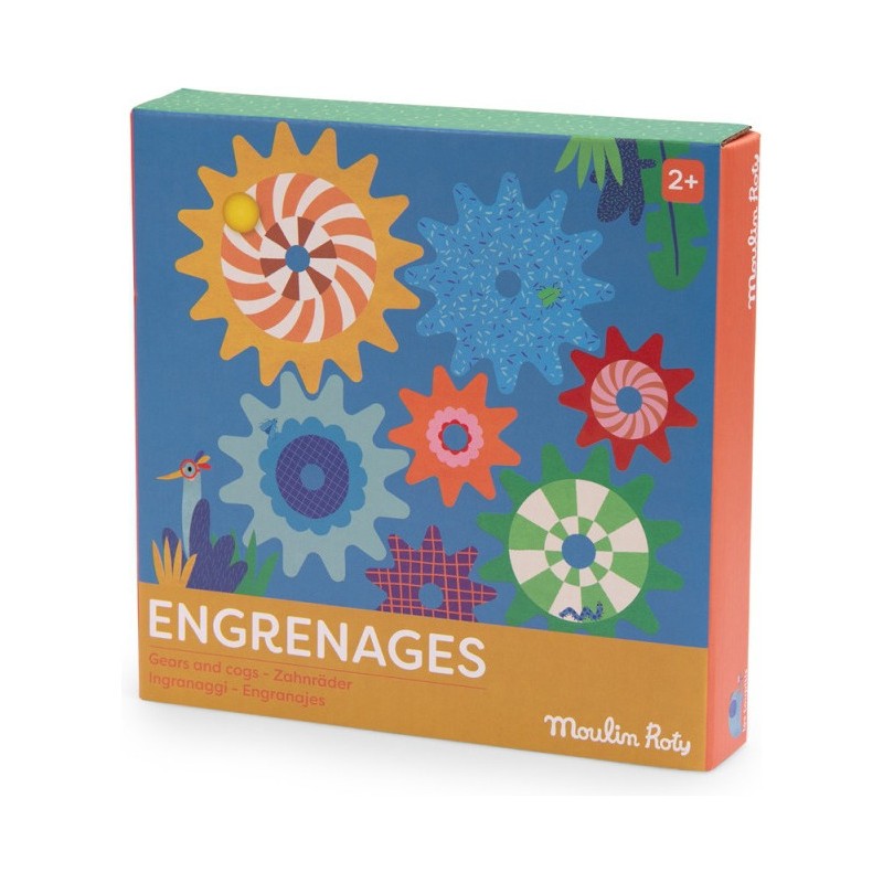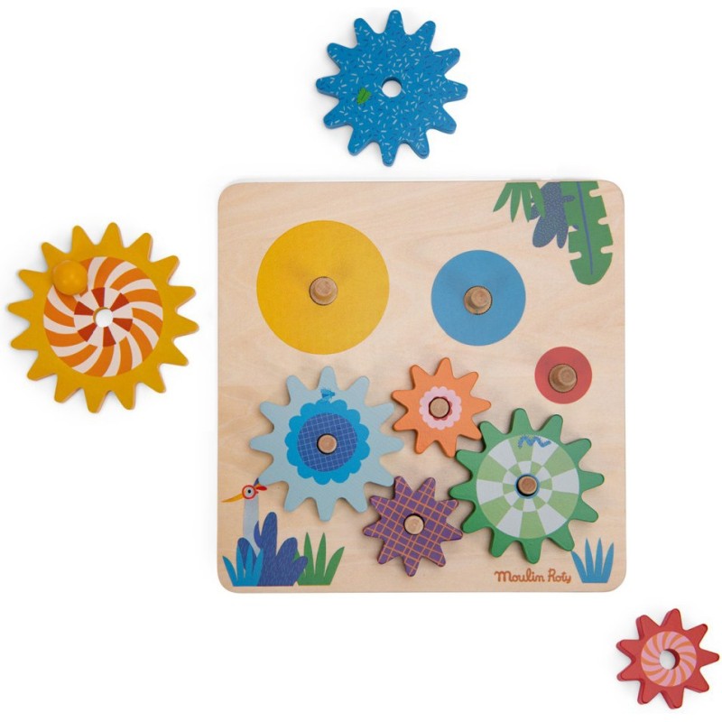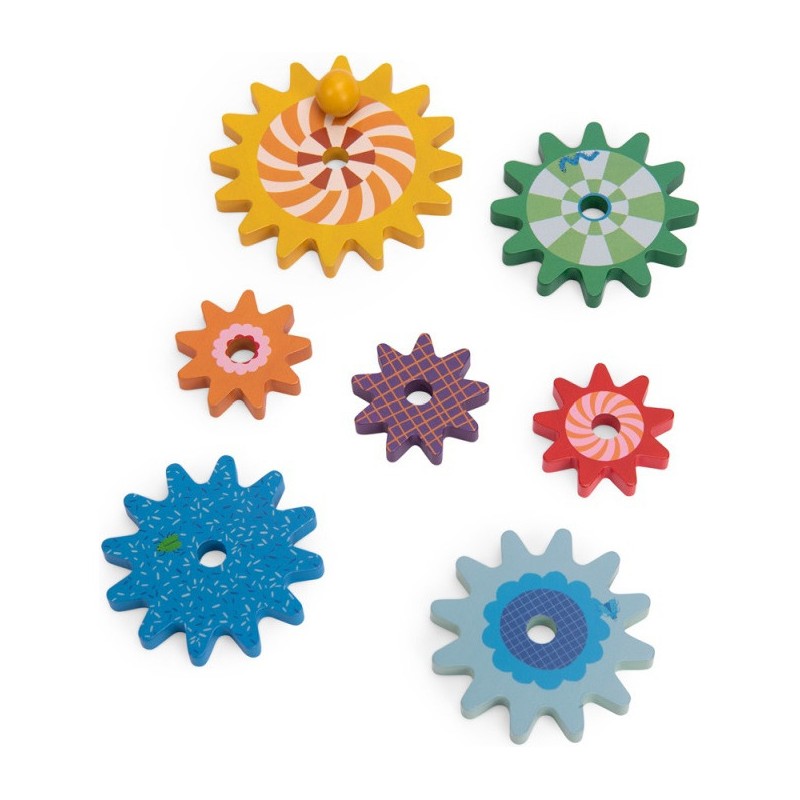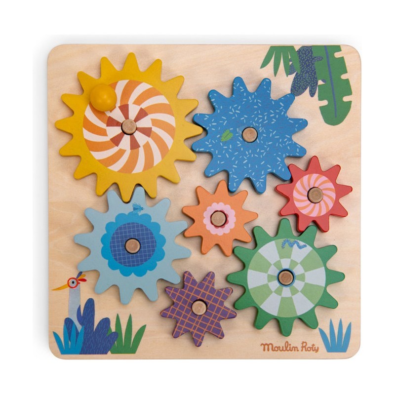 Jeu en bois pour découvrir les mécanismes à engrenages. 7 roues crantées multicolores à positionner au bon endroit sur les piliers en bois. En actionnant la roue jaune avec la poignée, l'ensemble se met à tourner dans tous les sens. Dès 2 ans.