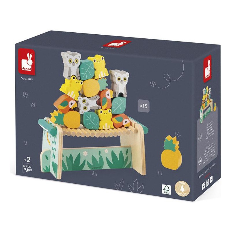 Y aura-il de la place pour tout le monde sur le pont suspendu ? Ce pont de singe en bois au cœur de la forêt tropicale est prêt à accueillir une foule d'animaux qui souhaitent le traverser ! Grenouilles, lémuriens et perroquets, mais aussi des feuilles et des ananas vont devoir trouver l'équilibre dans ce jeu d'adresse haut en couleurs. On assemble d'abord le pont en 3 parties, puis on s'amuse seul ou à plusieurs à empiler les éléments sans tout faire tomber ! Un jeu d'équilibre en bois qui amusera les enfants à partir de 2 ans. 15 pièces en tout sont à empiler, ce qui aidera bébé à développer sa dextérité et sa concentration : il faudra être minutieux et patient pour faire tenir tous ces animaux rigolos sur le pont ! Ce jouet d'éveil est en bois issu de forêts gérées durablement, certifiées Fsc. Peinture à l'eau.