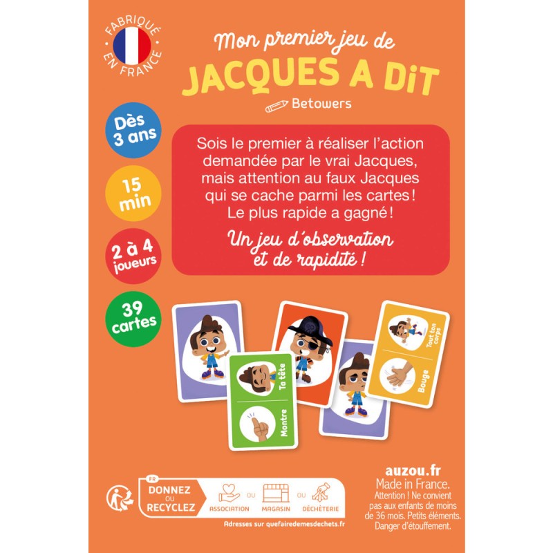 Découvrez mon premier jeu de cartes de Jacques a dit de la marque Auzou ! Sois le premier à réaliser l’action demandée par le vrai Jacques… mais attention aux faux Jacques qui se cachent parmi les cartes ! Le plus rapide a gagné. Nombres de joueurs : 2 à 4 joueurs
