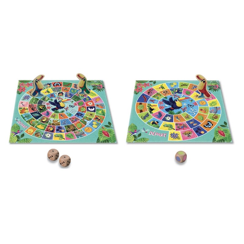 Retrouvez un grand classique chez Auzou : le jeu de l’oie mais cette fois-ci au coeur de la jungle ! Découvrez ce jeu mondialement connu revisité sous les pinceaux de Miriam Bos, et soyez le premier à faire arriver votre toucan au bout de la jungle. En plus de ses 4 beaux pions et ses 3 dés en bois rangés dans un superbe sac en toile, le plateau de jeu recto-verso permet d’avoir deux niveaux ! Le jeu classique et aussi un niveau plus facile avec moins de cases et un dé coloré pour avancer sans avoir à compter accessible à partir de 3 ans !