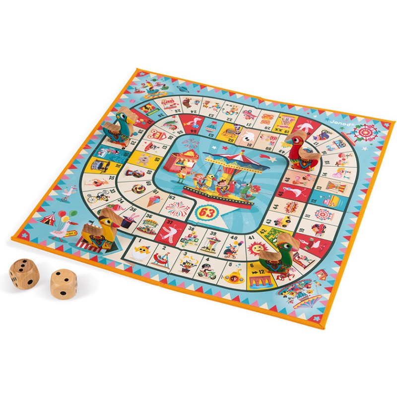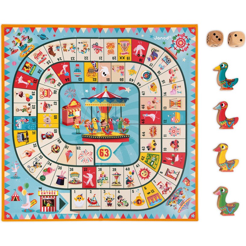 Aidez votre oie à retrouver le manège Évitez les pièges et soyez la première à amener votre oie à la fin du parcours. Il s'agit d'un jeu familial qui peut être apprécié par tous les âges. Il présente des illustrations amusantes et un thème lié à la fête foraine. Ce jeu est idéal pour stimuler la concentration et l'observation, mais aussi pour s'amuser ! Un plateau en carton de 28 x 28 cm, 1,5 mm d'épaisseur, quatre oies en bois de 3,5 x 1 x 4 cm et deux dés en bois de 2 x 2 x 2 cm chacun. Pour un rangement facile, le plateau en carton peut être plié. Plusieurs langues sont disponibles pour les règles du jeu. Deux à quatre joueurs.