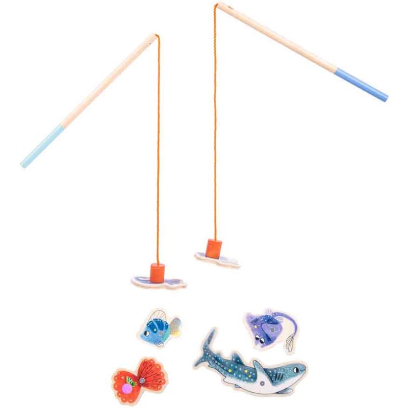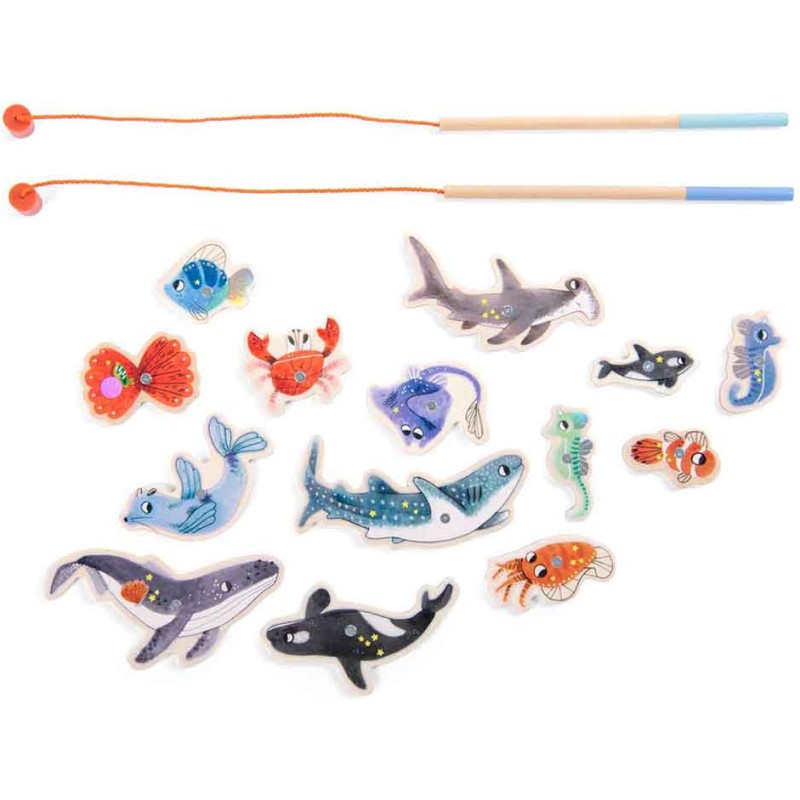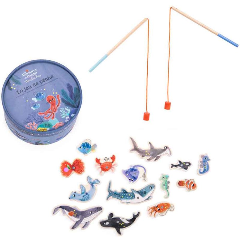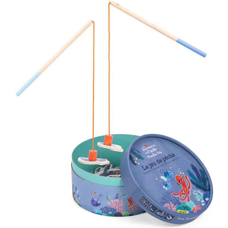 Jeu de pêche à la ligne, comprenant 2 cannes et 14 pièces aimantées poissons et crustacés, numérotées. Le but du jeu est de récolter le plus vite possible un maximum de pièces rapportant chacune, un certain nombre de points... mais attention au crabe! Plouf ! Voilà Paulie, le petit poulpe malicieux.
