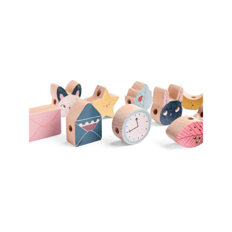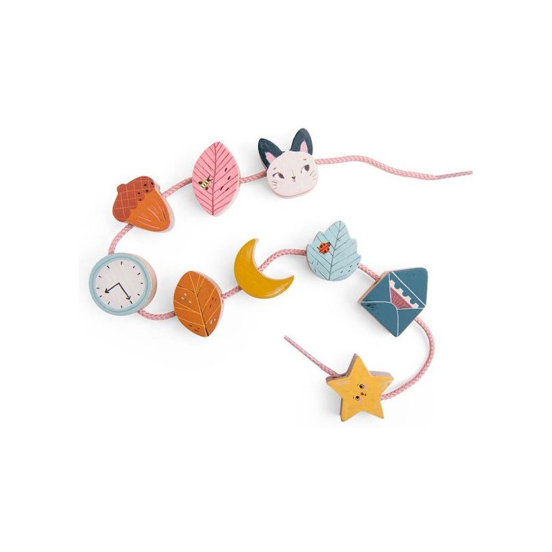 Jeu de manipulation de la collection Après la pluie, composé de 14 perles en bois de couleurs et de formes variées à enfiler sur un lacet. Il comprend 2 lacets et un sac de rangement en tissu.