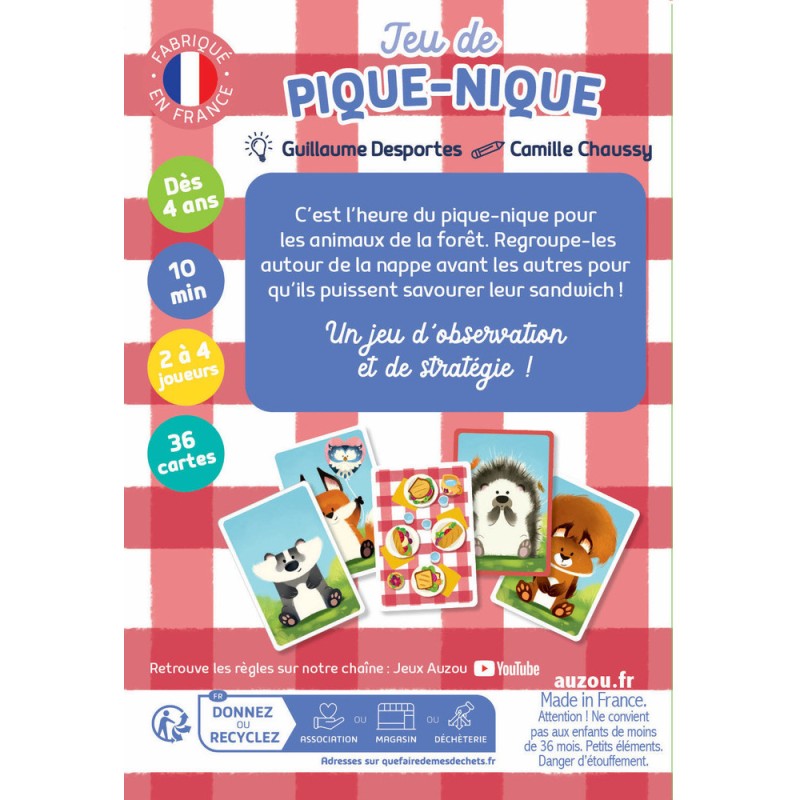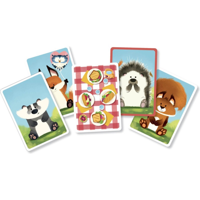 C’est l’heure du pique-nique pour les animaux de la forêt. Regroupe-les autour de la nappe avant les autres pour qu’ils puissent savourer leur sandwich ! Un jeu de mémoire et de stratégie ! But : Réunir 4 animaux différents autour de la nappe et la carte Sandwich !