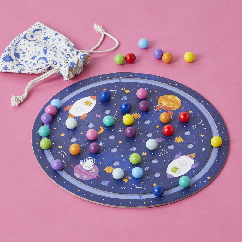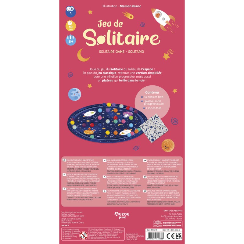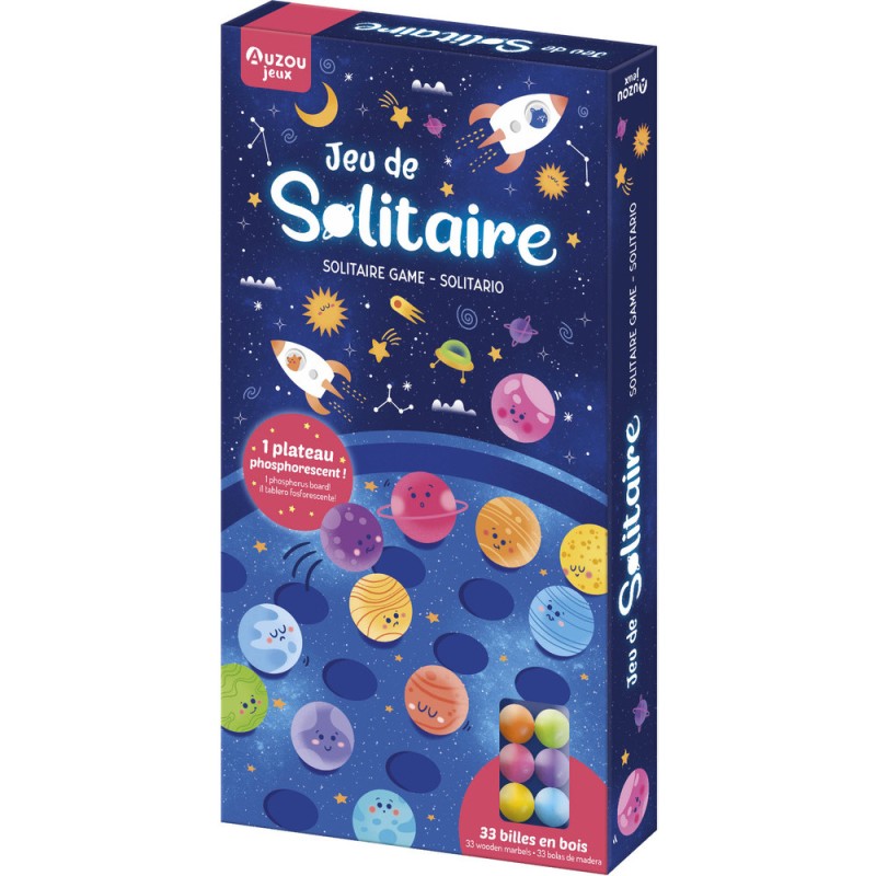 Joue au jeu du Solitaire au milieu de l'espace ! Le joueur déplace une bille par-dessus une autre proche d'une case vide. Cette dernière est alors retirée du tablier. Le but est d'arriver à n'avoir à la fin qu'une seule bille sur le plateau. En plus du jeu classique, retrouve une version simplifiée pour une initiation progressive mais aussi, un plateau qui brille dans le noir !