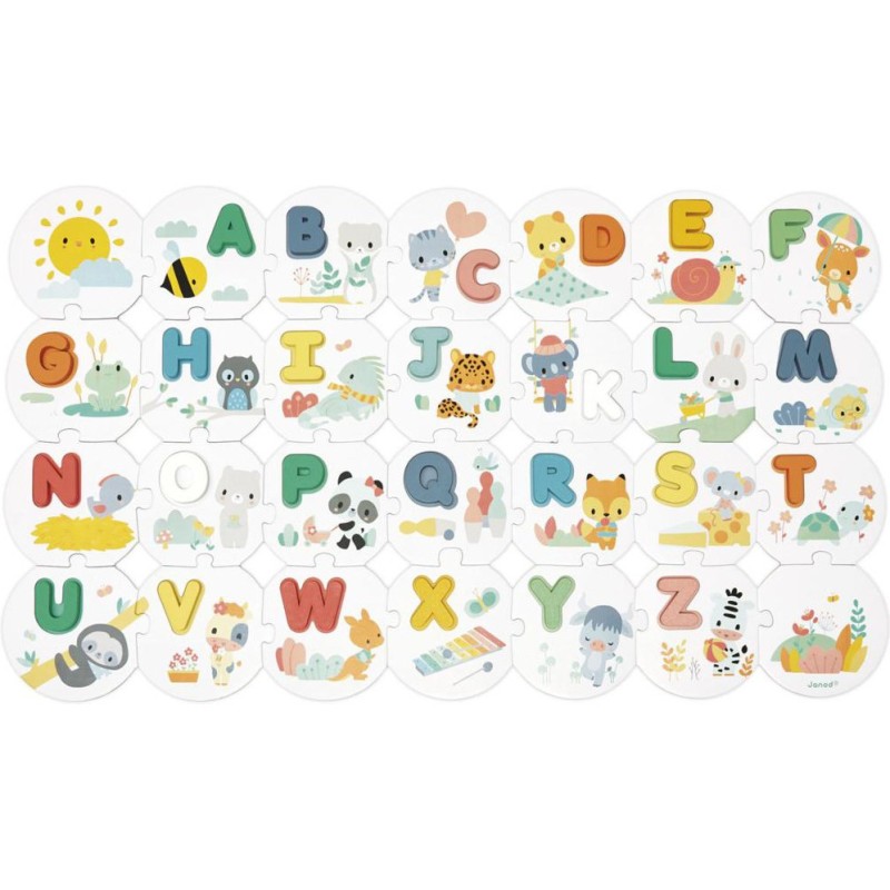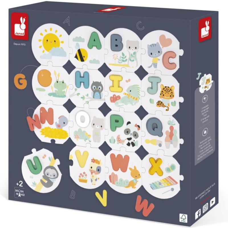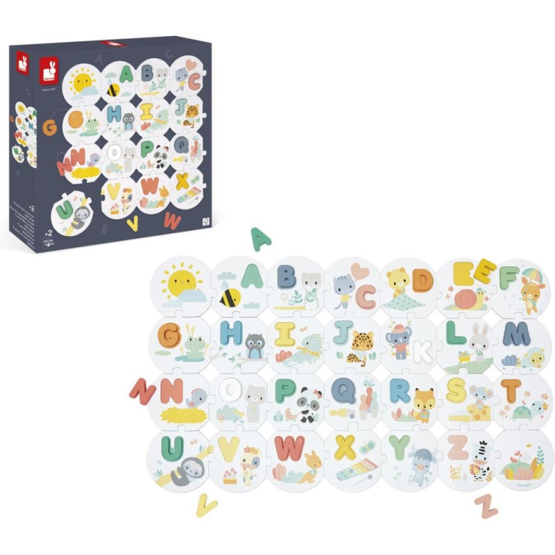 C'est parti pour une belle aventure au pays des lettres avec nos jolis dessins aux couleurs tendres ! On apprend l’alphabet en douceur et en s'amusant avec ce grand puzzle alliant à la fois des pièces en carton et des lettres en bois à encastrer. On commence par reconstituer le puzzle et ses 28 pièces joliment illustrées, puis on s'amuse à retrouver l'emplacement de nos lettres capitales en bois de toutes les couleurs grâce à l'ordre alphabétique. Pour s'aider et pour apprendre les sons en même temps, on compte sur les insectes, les animaux et les objets de chaque pièce ! B comme Belette, D comme Doudou, U comme Unau (petit paresseux) ou encore W comme Wallaby (petit kangourou)… On apprend en même temps à reconnaitre ce que l'on observe ! Un modèle est fourni pour aider les plus petits dans les premiers temps de jeu. Ce jeu éducatif est également idéal pour développer la motricité fine et la mémoire. Pratique, un sac en coton permet de ranger toutes les pièces une fois le jeu terminé. Ce jouet d’éveil est fabriqué en bois et en carton Fsc.