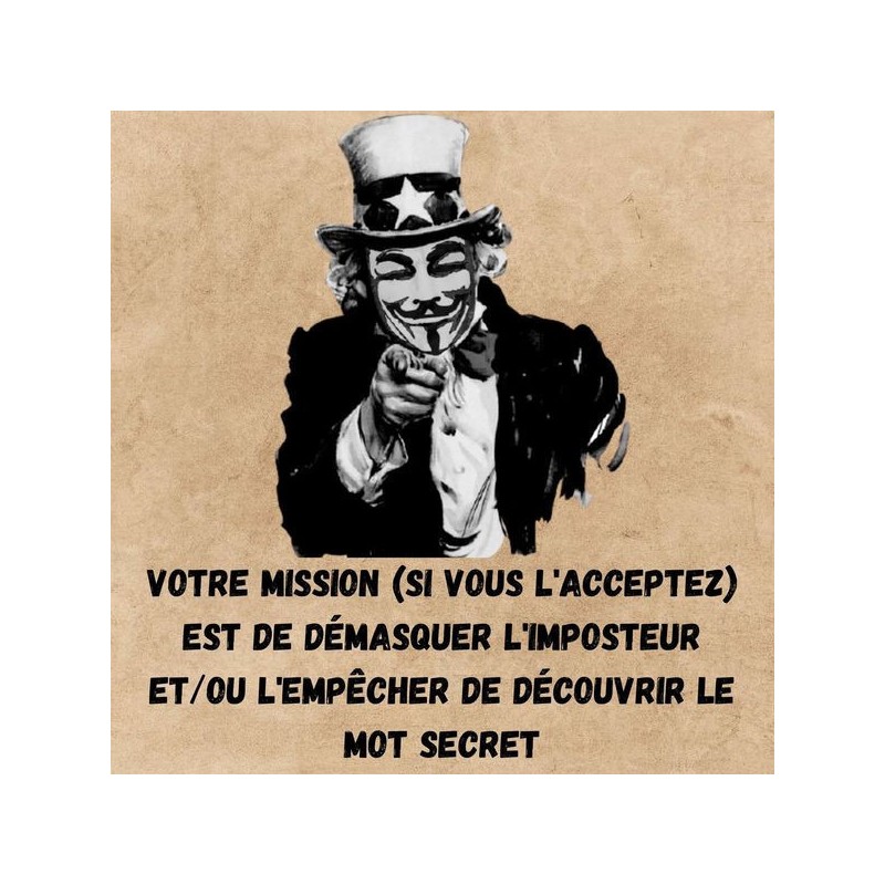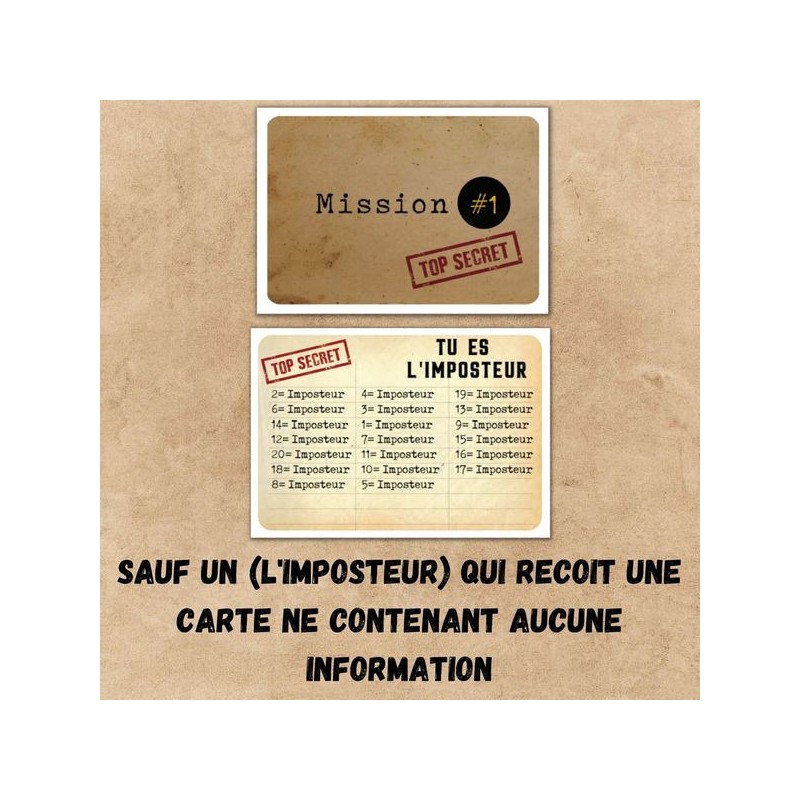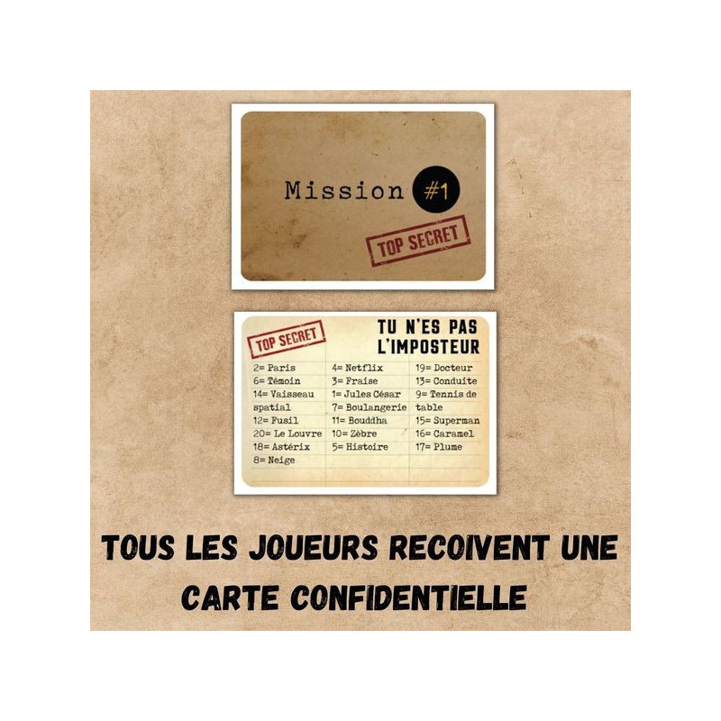 Au départ, chaque joueur prend connaissance du mot secret en recevant une carte confidentielle, sauf un, qui recevra une carte ne comportant aucune indication sur le mot secret. Ce joueur sera donc l’imposteur. Pendant 3 tours et à tour de rôle, chaque joueur va communiquer un mot-indice en rapport avec le mot secret pour prouver son innocence au groupe.
