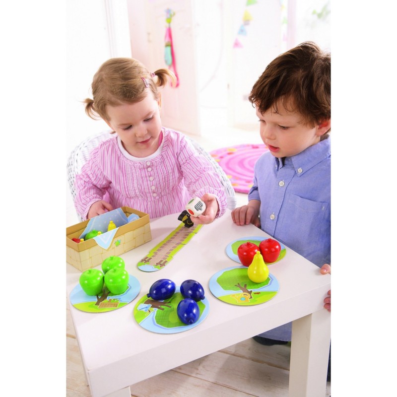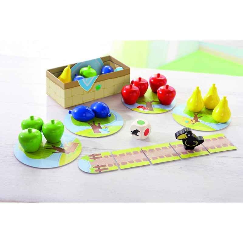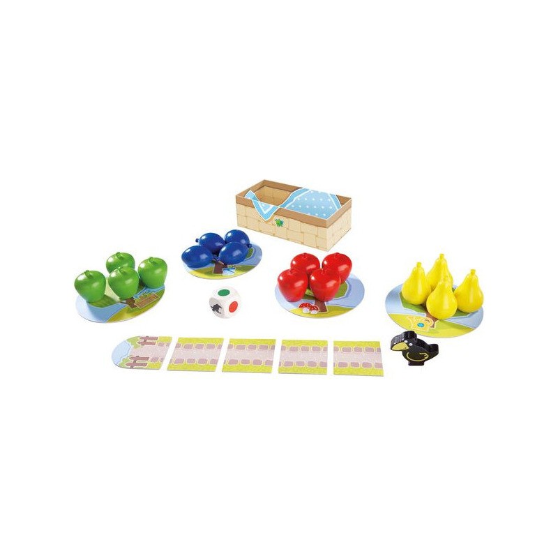 Pour les tout-petits, la marque Haba a adapté son jeu Le verger. Les pièces sont grosses et moins nombreuses. Elles peuvent être dans un premier temps manipulées librement. Dans le jeu à règle tous les joueurs jouent contre le corbeau. Les fruits sont posés sur les arbres et le corbeau est posté à l'entrée du chemin qui mène au verger. Chaque joueur à son tour lance le dé. Si le dé tombe sur bleu, rouge, vert ou jaune, le joueur cueille un fruit de la couleur correspondante et le dépose dans le panier. Si le dé tombe sur la face panier, le joueur prend le fruit de son choix (joker). S'il s'agit du corbeau, ce dernier avance d'une case sur le chemin. Il faut avoir cueilli tous les fruits avant que le corbeau arrive au verger. Inclus dans la boîte : - 1 corbeau en bois - 1 panier pour ranger tous les fruits - 16 fruits (pomme verte -3,5 x 3,5 cm-, pomme rouge, poire, prune) - 4 cartes rondes "arbre" - 5 cartes "chemin" (les cartes sont en carton épais et rigide, très résistantes), - dé (3 x 3 cm) - règle. Ce jouet est idéal pour initier les petits aux jeux de société. N'hésitez pas et offrez ce jeu à un enfant qui sera ravi de le découvrir avec ses parents !