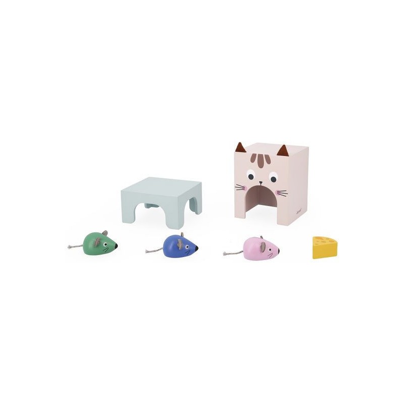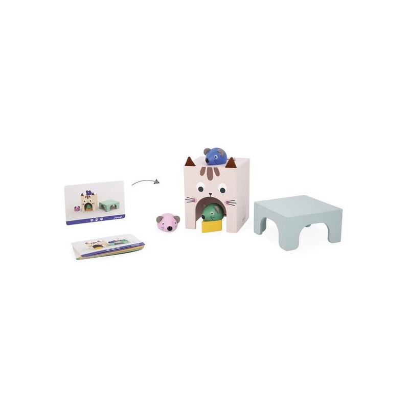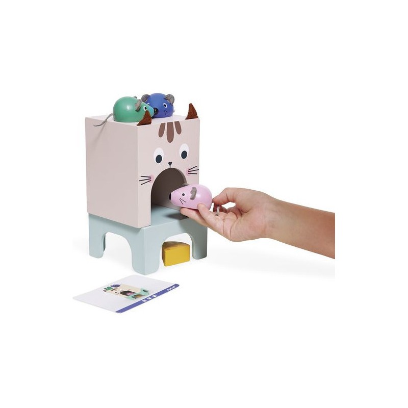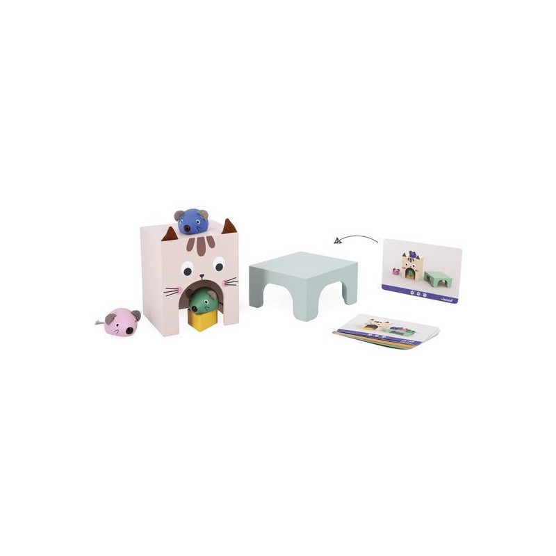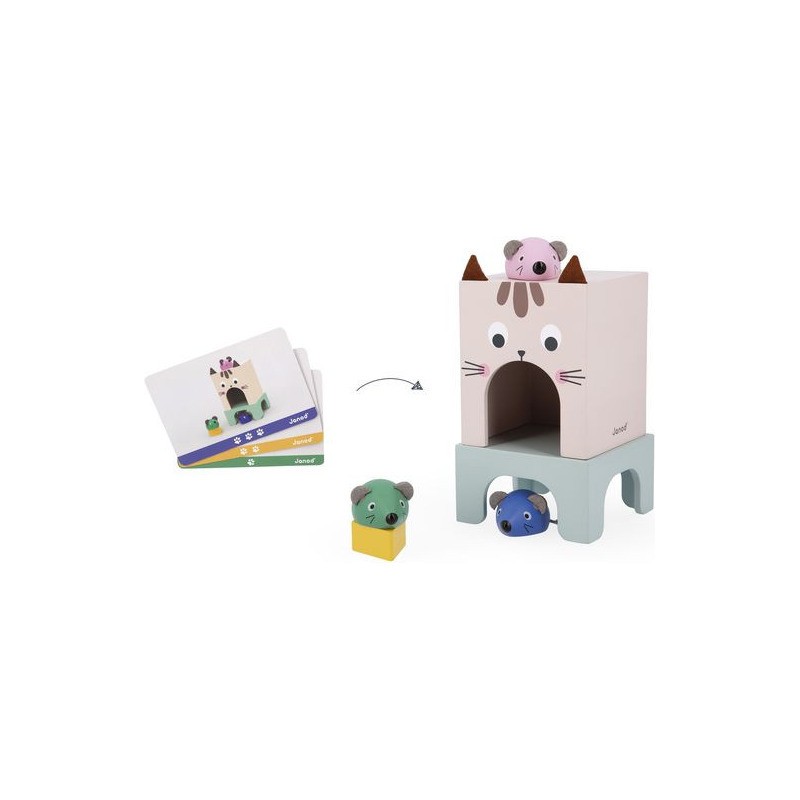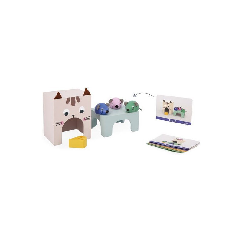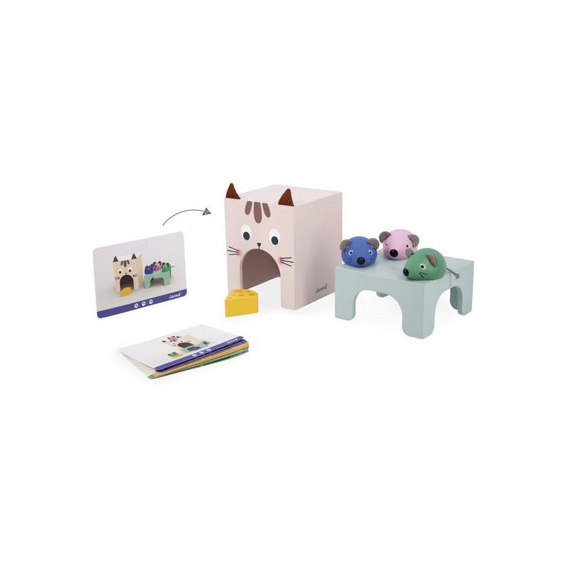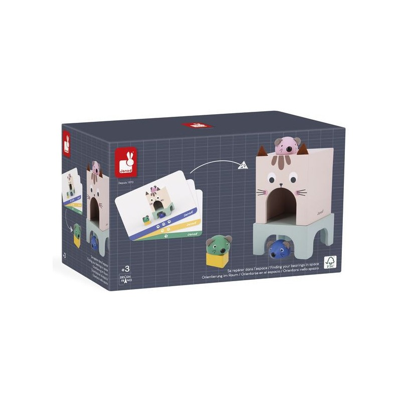 Appréhender les apprentissages de la maternelle tout en s'amusant, c'est la promesse de ce beau jeu éducatif en bois ! Il aidera les plus petits à comprendre les repères dans l'espace et à enrichir leur vocabulaire ! C'est parti pour une course folle entre le chat et les souris ! 3 souris en bois de couleurs différentes, un morceau de fromage et un chat (symbolisé par la boite) attendent les enfants dès 3 ans pour jouer ensemble. En s'appuyant sur les 12 cartes modèles recto-verso, les petits devront reproduire une scène et par la même occasion acquérir le vocabulaire associé : devant/derrière, au-dessus/en-dessous, sur/dans, à l’intérieur de, à côté, entre… Ils développeront également leur sens de l'observation. Il existe 3 niveaux de difficulté représentés par des couleurs sur les cartes. Au fur et à mesure, l'enfant pourra passer de 2 éléments à placer à 6. Ce jeu peut être utilisé en atelier autonome mais également en duo avec un adulte décrivant la scène que l'enfant pourra reproduire en développant ainsi sa compréhension orale. Ce jeu éducatif en bois est qui plus est très joli ! Les enfants vont adorer découvrir et manipuler ces adorables petites souris et leur fromage et jouer à cache-cache avec le chat ! Une notice explicative vous permettra d'utiliser au mieux ce jeu destiné aux enfants de petite, moyenne et grande section de maternelle. Ce jeu fait partie de la gamme pédagogique Janod, développée en collaboration avec une professeure des écoles afin de coller au mieux aux apprentissages et aux programmes de chaque niveau. Ce jeu est en bois et carton Fsc.