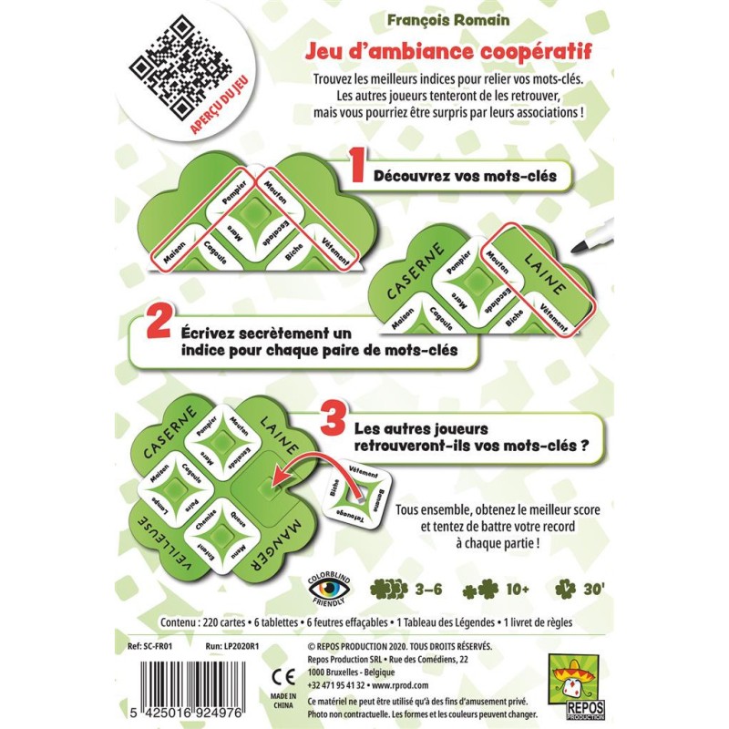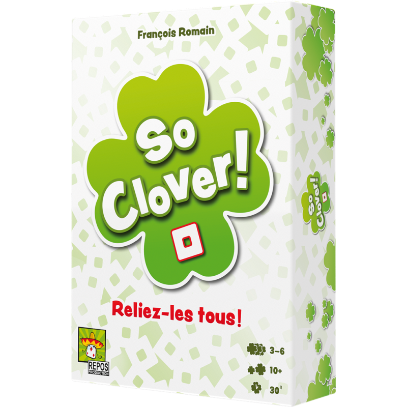 La nouvelle référence du jeu d’association d’idée ! Dans So Clover ! vous jouez tous ensemble pour obtenir le meilleur score. Chaque joueur créé 4 paires de Mots-Clés (x16) en inscrivant secrètement, sur sa tablette en forme de trèfle, le point commun qui les relie. Ces 4 mots deviennent alors des indices. Ensuite, les Mots-clés sont mélangés à 4 intrus et c’est ensemble, qu’il faut tenter de retrouver les 4 paires de Mots-Clés de chaque joueur. Plus on retrouve de mots, plus on marque de points.