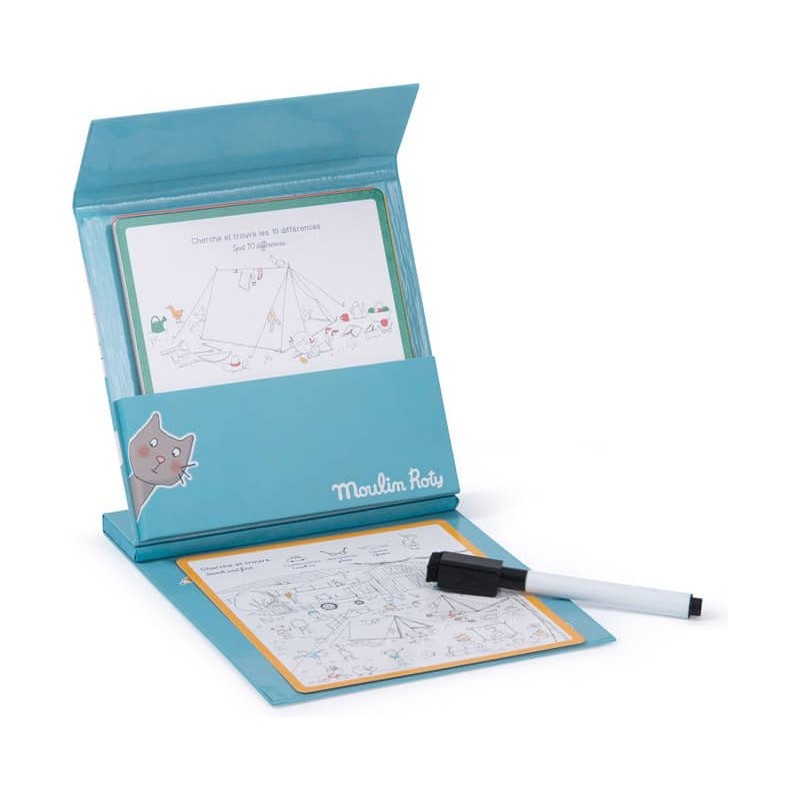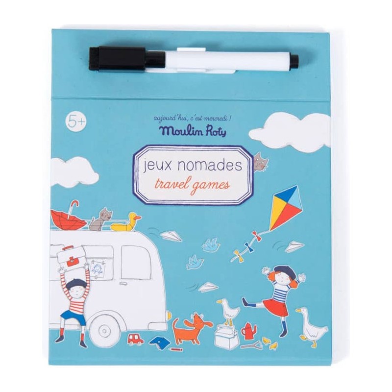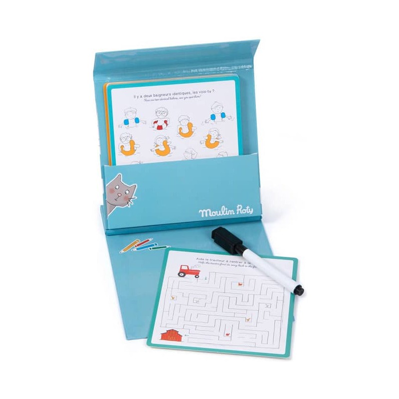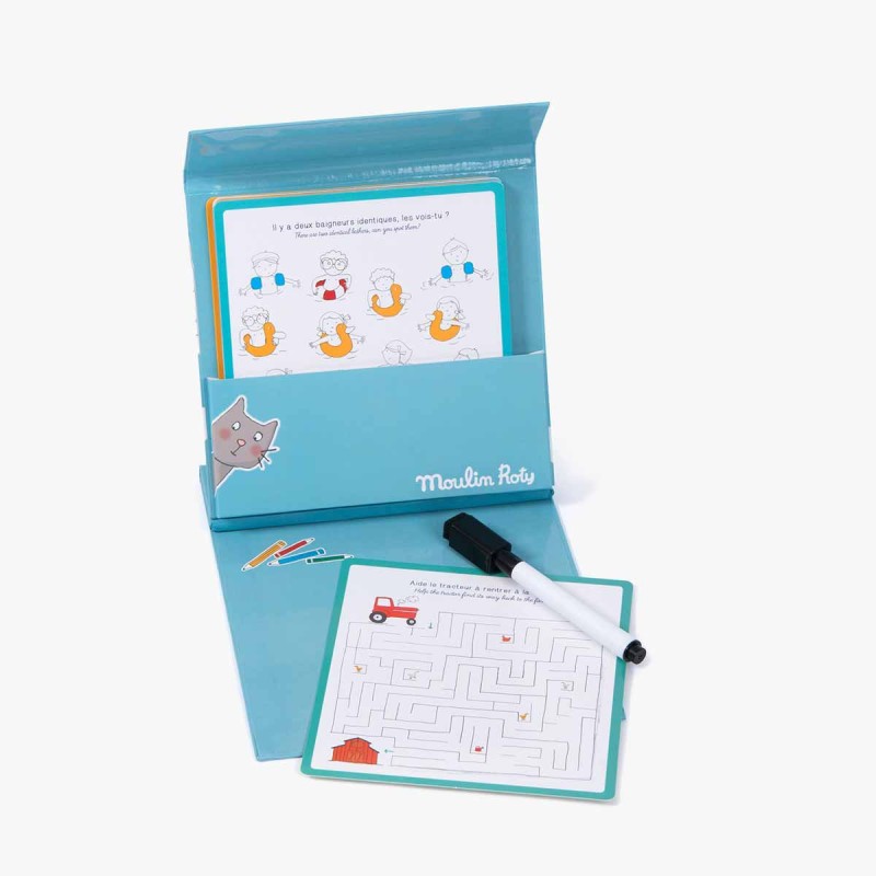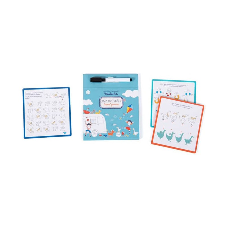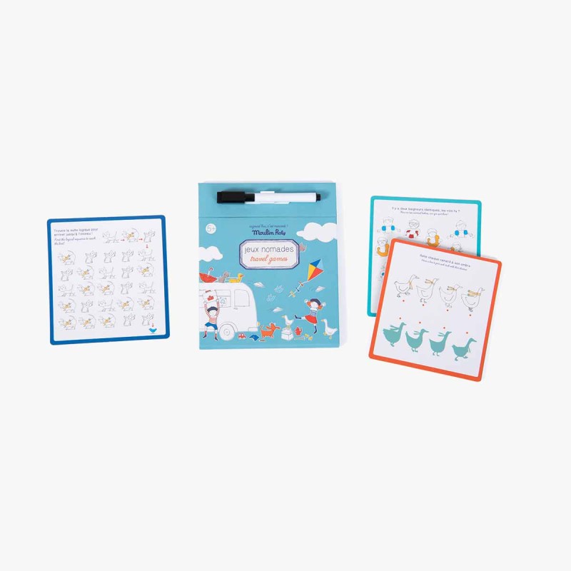 Jeux nomades à emporter partout avec soi ! La boîte comporte une planche de jeu, un crayon effaçable et 15 cartes de jeux d'observation et de logique, avec les solutions. Idéal pour occuper les enfants lors des longs trajets.