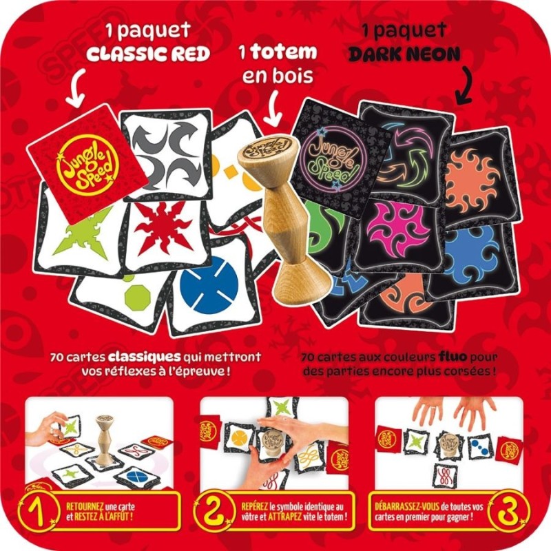 Jungle Speed est un jeu d’ambiance et de rapidité. Retournez une carte chacun votre tour. Si elle est identique à celle d’un adversaire, prenez le totem avant lui et donnez-lui vos cartes ! Mais ne vous trompez pas ! Dans cette édition La Totale, deux paquets de cartes différents sont inclus pour toujours plus de fun !