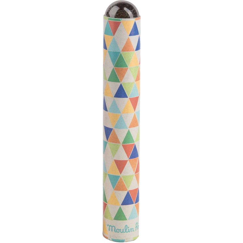 Tube en carton aux illustrations « damier » très colorées, avec loupe à son extrémité. Porter le tube à son ? il, en le tournant, la loupe et les petits miroirs intérieurs, démultiplient à l'infini ce que l'on voit et créent ainsi une succession de combinaisons de formes et de couleurs.