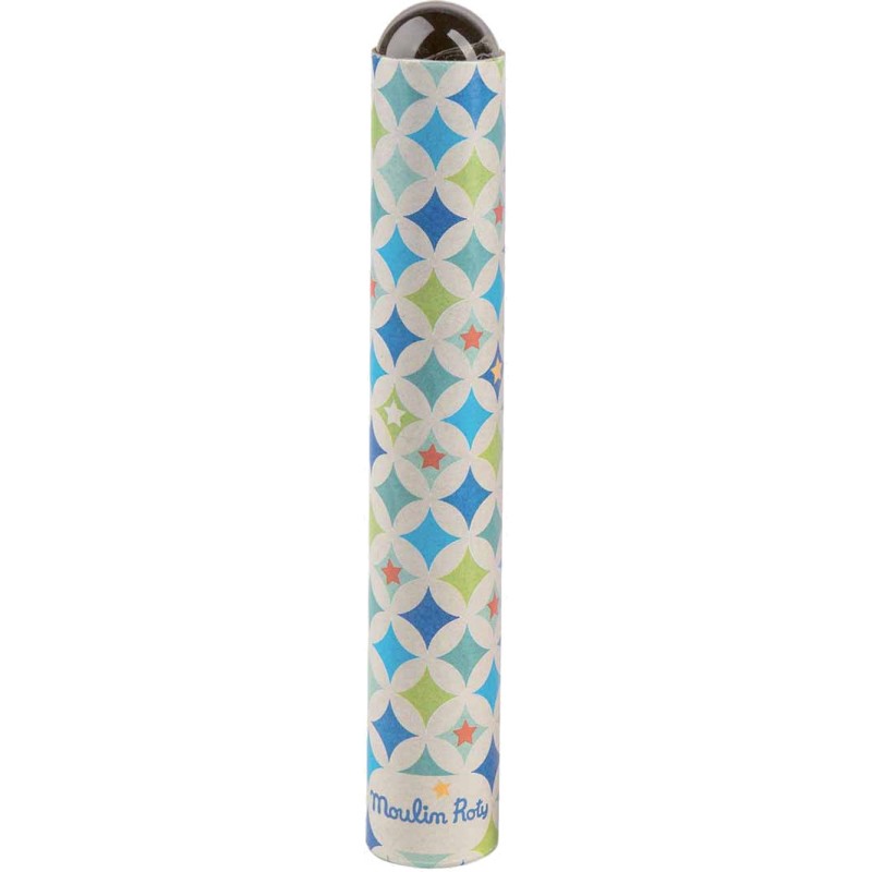 Tube en carton aux illustrations « losanges » très colorées, avec loupe à son extrémité. Porter le tube à son ? il, en le tournant, la loupe et les petits miroirs intérieurs, démultiplient à l'infini ce que l'on voit et créent ainsi une succession de combinaisons de formes et de couleurs.