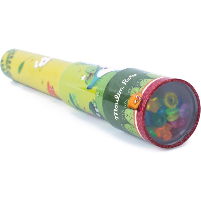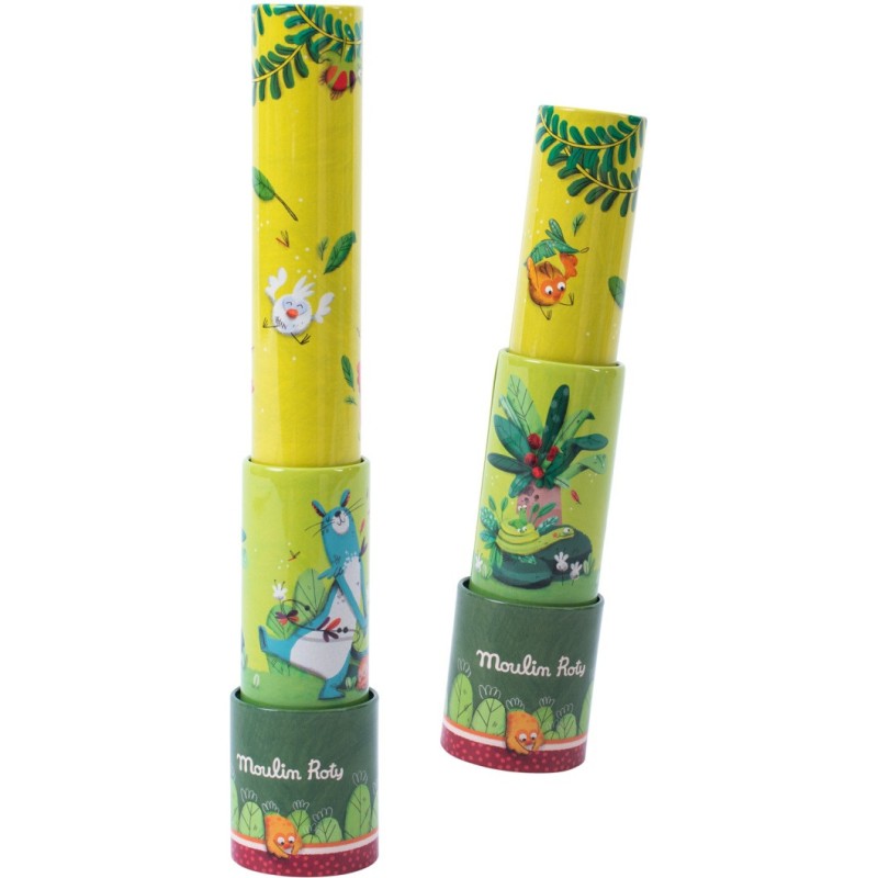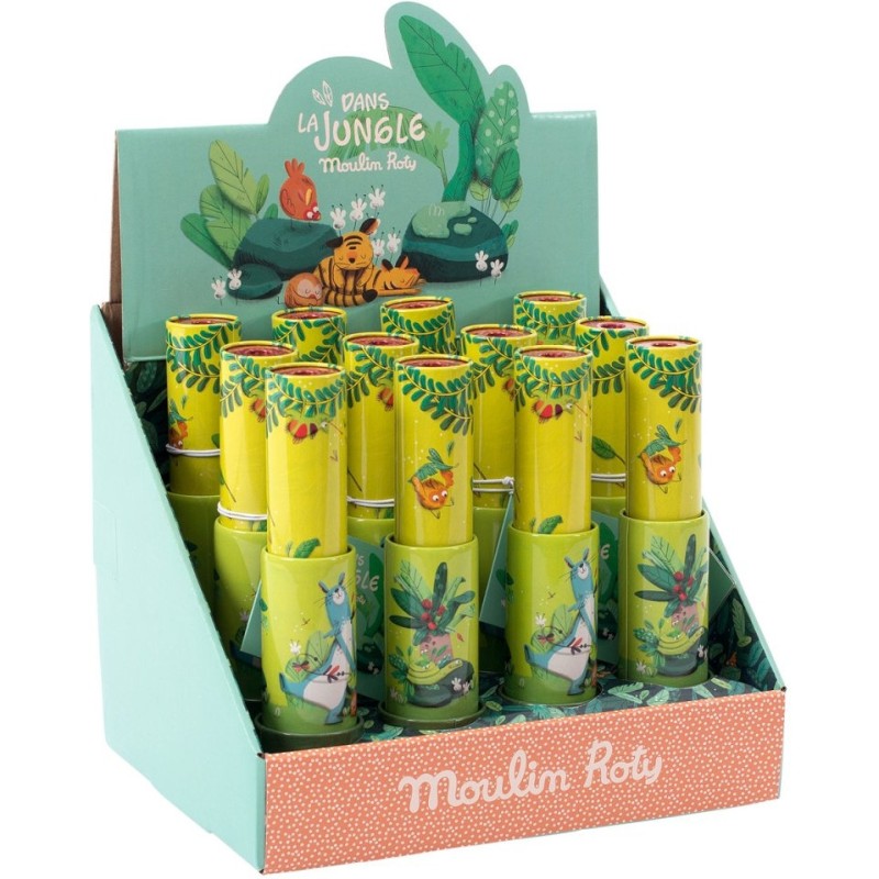Kaléidoscope en métal coloré, illustré de l'univers Dans la jungle. Tourner, en même temps et à contre sens, les deux parties du Kaléidoscope pour découvrir toujours plus de nouvelles combinaisons de couleurs. Dans la Jungle, Pakou, Zimba, Koco et Paloma s’amusent entre les feuilles de bananiers, la partie de cache-cache est lancée !