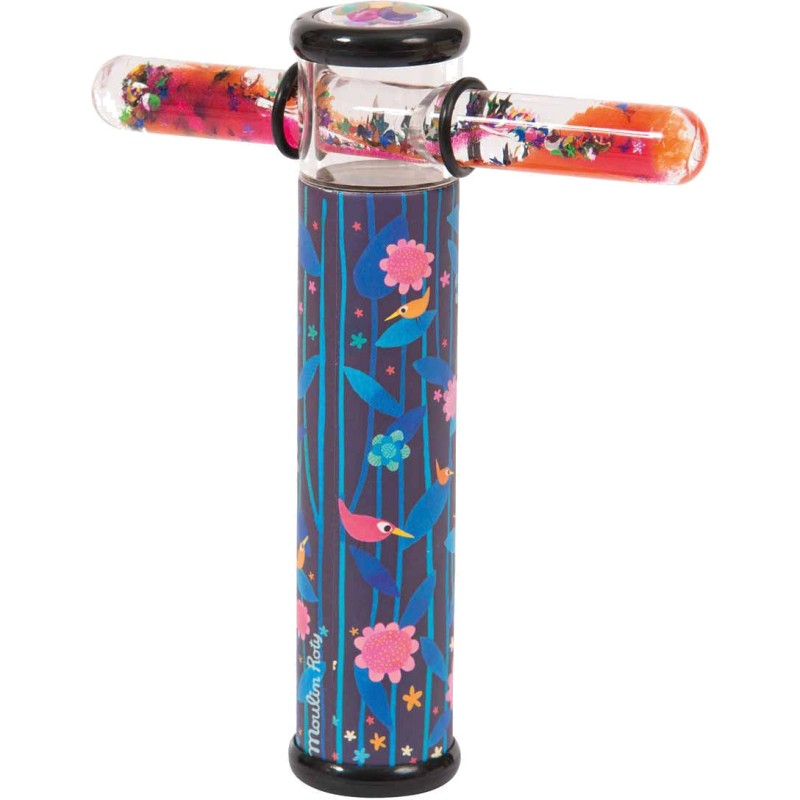 Kaléidoscope aux illustrations naïves et colorées oiseaux et végétaux avec à son extrémité un tube coulissant contenant du gel et des paillettes qui, associé aux petits miroirs du kaléidoscope, démultiplie à l'infini les combinaisons de formes et de couleurs. Les petites merveilles portent bien leur nom.