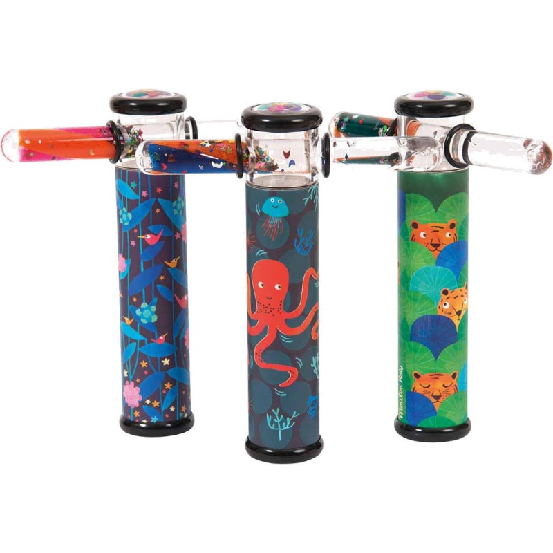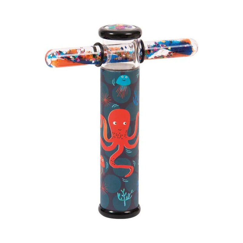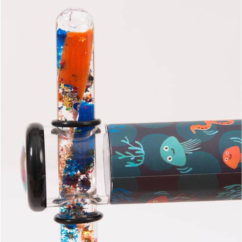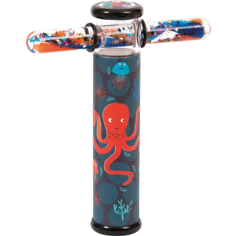 Kaléidoscope aux illustrations naïves et colorées pieuvres et coraux avec à son extrémité un tube coulissant contenant du gel et des paillettes qui, associé aux petits miroirs du kaléidoscope, démultiplie à l'infini les combinaisons de formes et de couleurs.