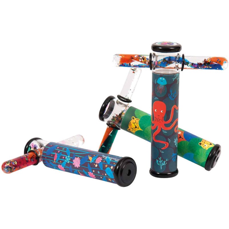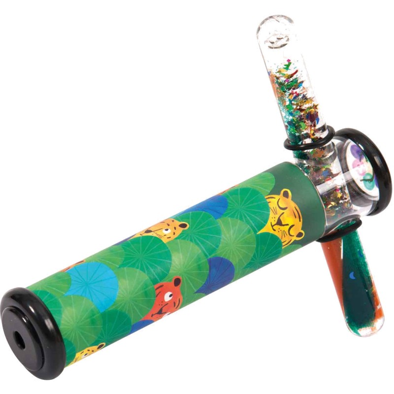 Kaléidoscope aux illustrations naïves et colorées tigres et jungle avec à son extrémité un tube coulissant contenant du gel et des paillettes qui, associé aux petits miroirs du kaléidoscope, démultiplie à l'infini les combinaisons de formes et de couleurs Les petites merveilles portent bien leur nom. Ces petits objets drôles et un peu magiques s’amusent à nous surprendre.
