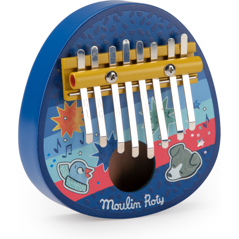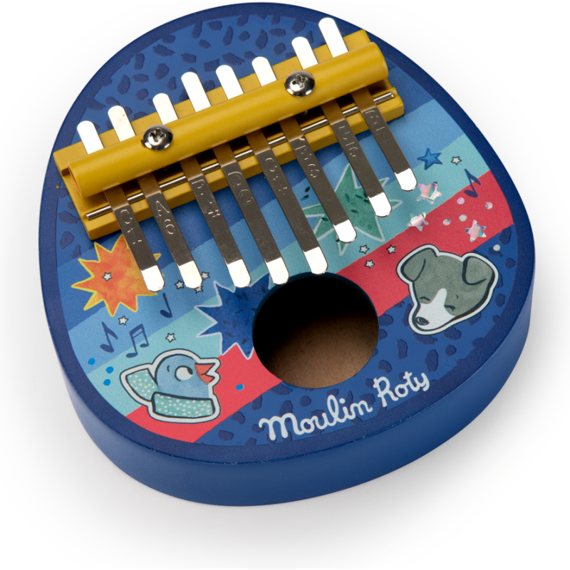 Kalimba en bois peint et lamelles métalliques, aux couleurs urbaines et vintage de Puce & Pilou. Cet instrument développe le rythme et l'éveil musical des tout-petits, avec des sons très doux.
