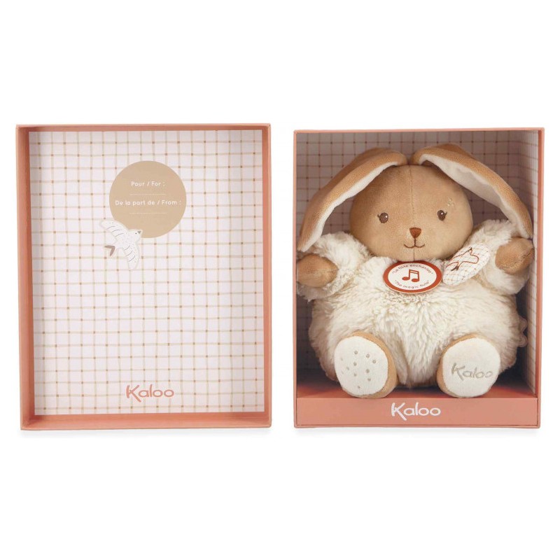 Le coffret peut être réutilisé comme boîte de rangement ou pour conserver les précieux souvenirs de bébé. Ce lapin musical Kaloo d’une douceur incomparable est le parfait cadeau de naissance. Confectionné avec soin, il est composé de fourrure synthétique, de micro-velours, de popeline, et de rembourrage en polyester recyclé.
