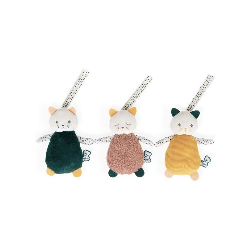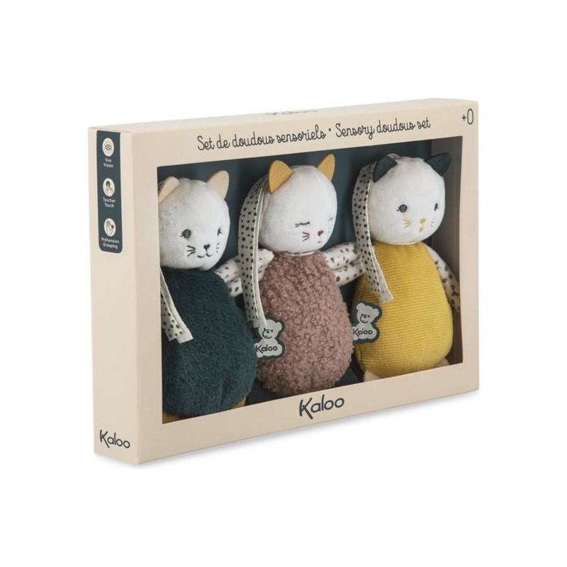 La collection de doudous Kaloo Stimuli contient trois petits jouets colorés en forme de chat qui éveilleront doucement les sens des bébés dès la naissance.