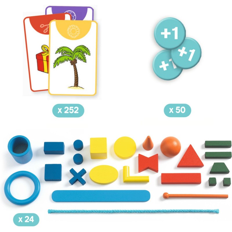 Contenu : 21 formes en bois + 1 ficelle + 240 cartes illustrées + 12 cartes vierges + 50 jetons victoire + 1 règle de jeu, 23 formes en bois + 1 ficelle + 240 cartes illustrées + 12 cartes vierges + 50 jetons victoire + 1 règle de jeu