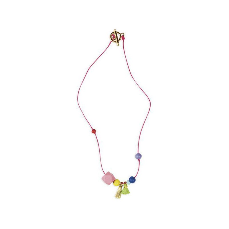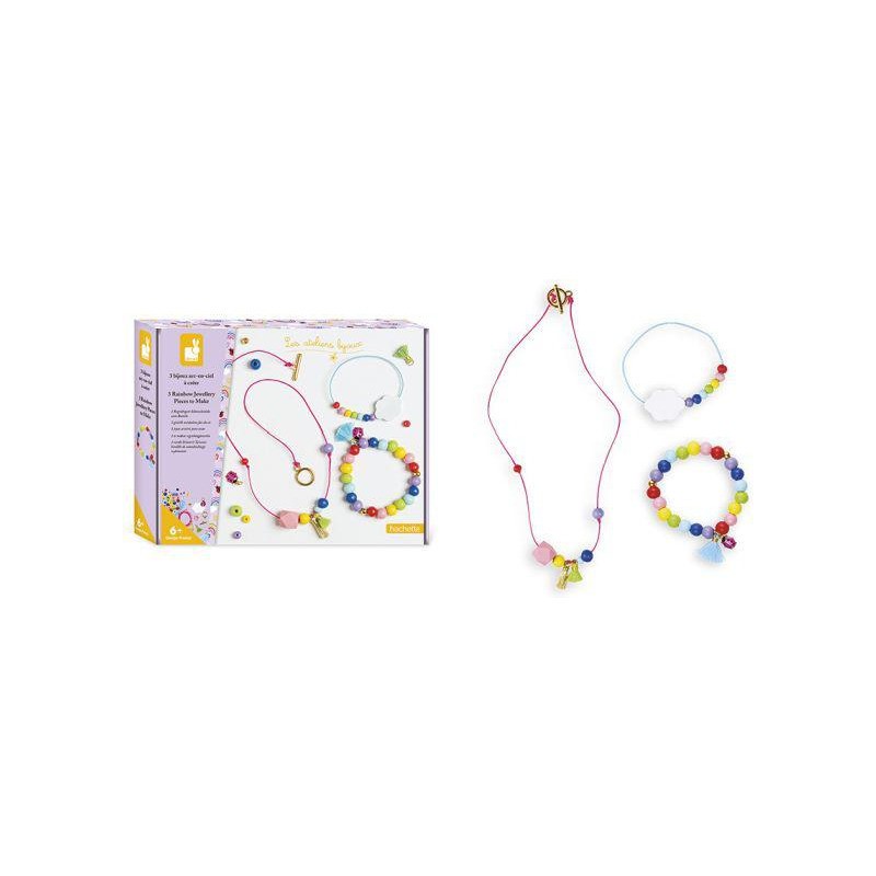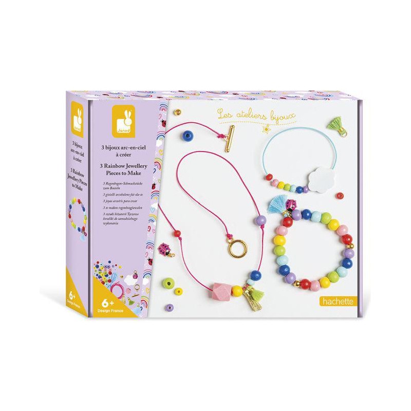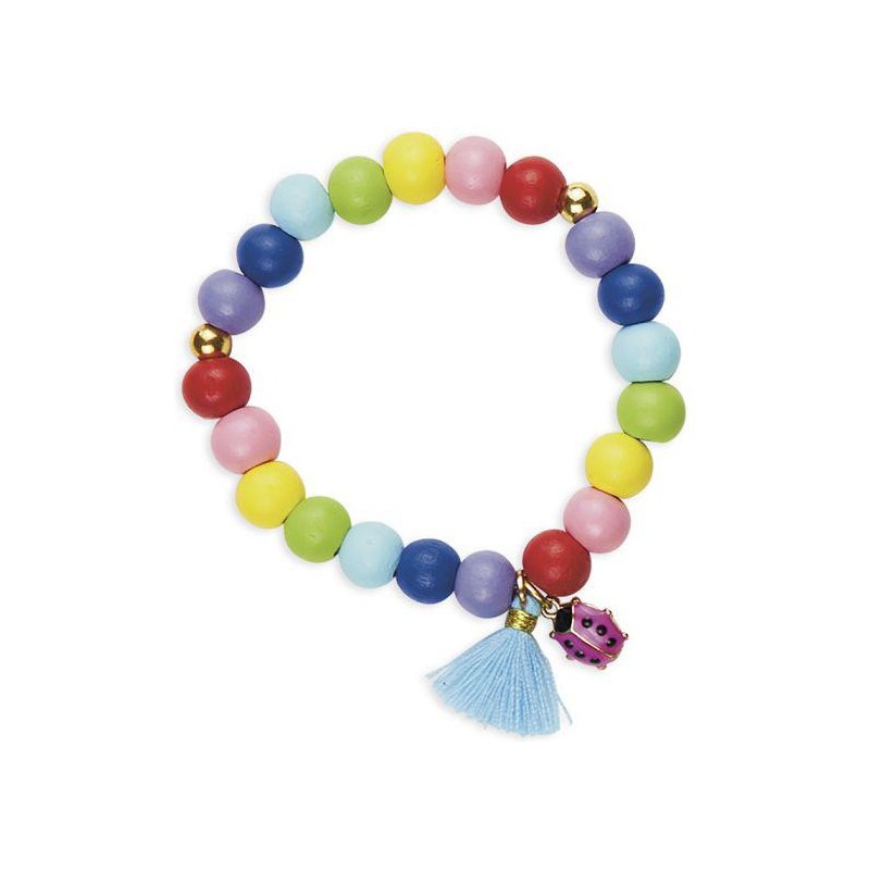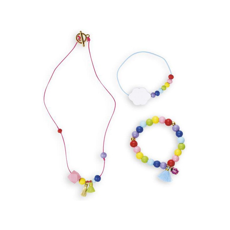 Créez vos propres bijoux avec des perles en bois de toutes les couleurs de l'arc-ciel. Ce kit comprend 2 bracelets et 1 collier, tous deux fabriqués à partir de perles de bois de couleurs vives. Chaque étape est illustrée dans un livre photo. Ces trois bijoux tendance seront ornés d'une breloque coccinelle, d'un symbole porte-bonheur et de pompons. C'est facile à faire et aidera les enfants à développer leur patience et leur motricité fine. Il leur faudra environ 20 minutes pour créer une pièce.