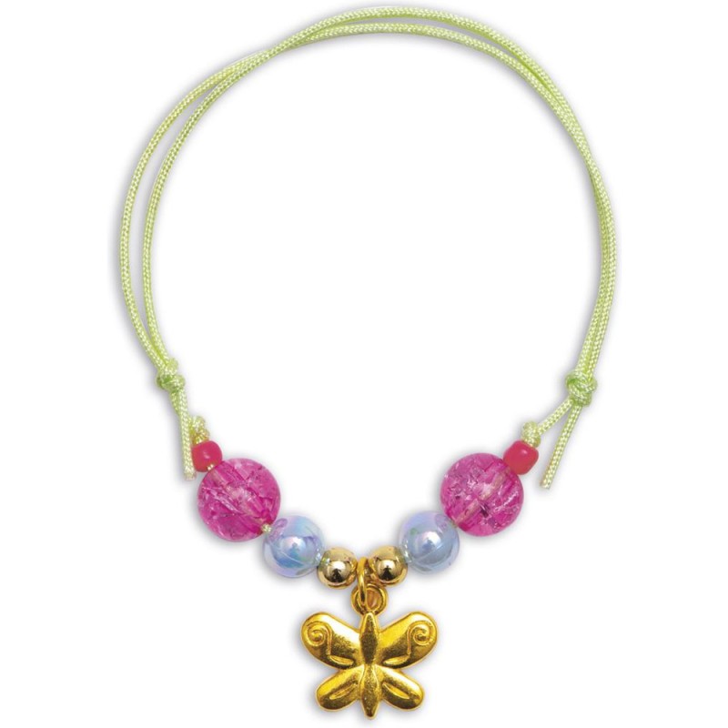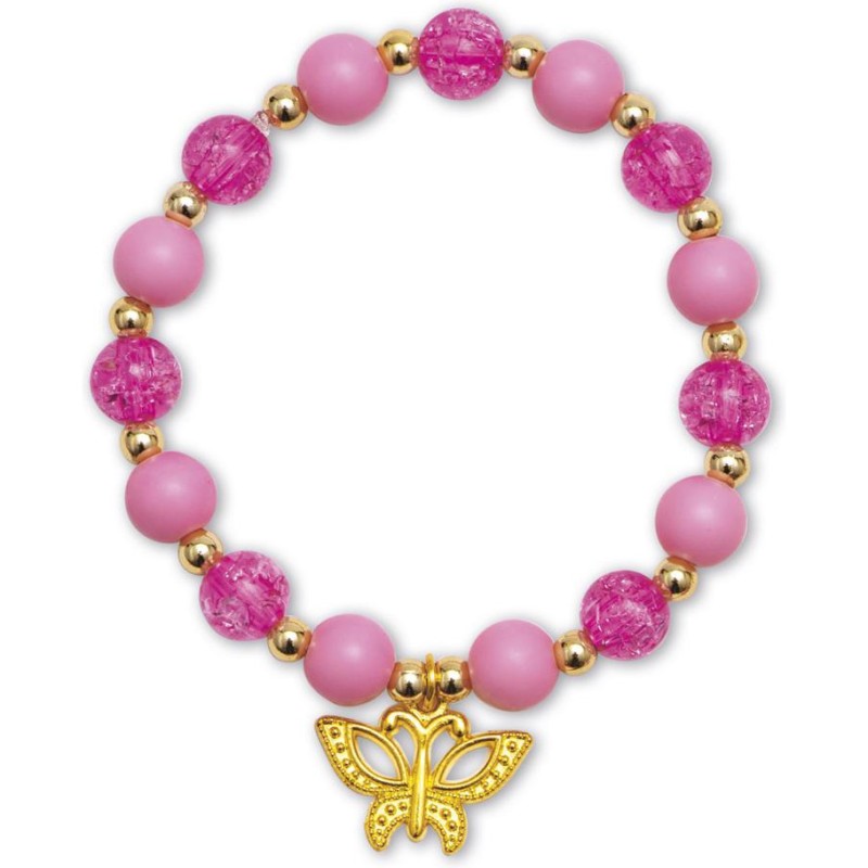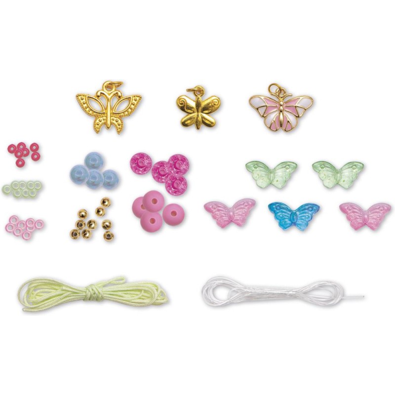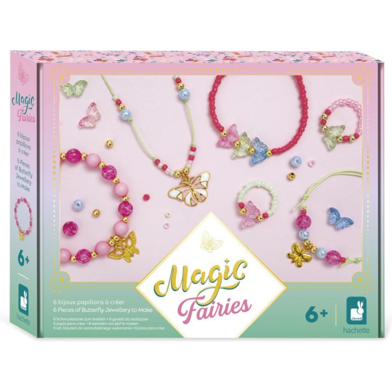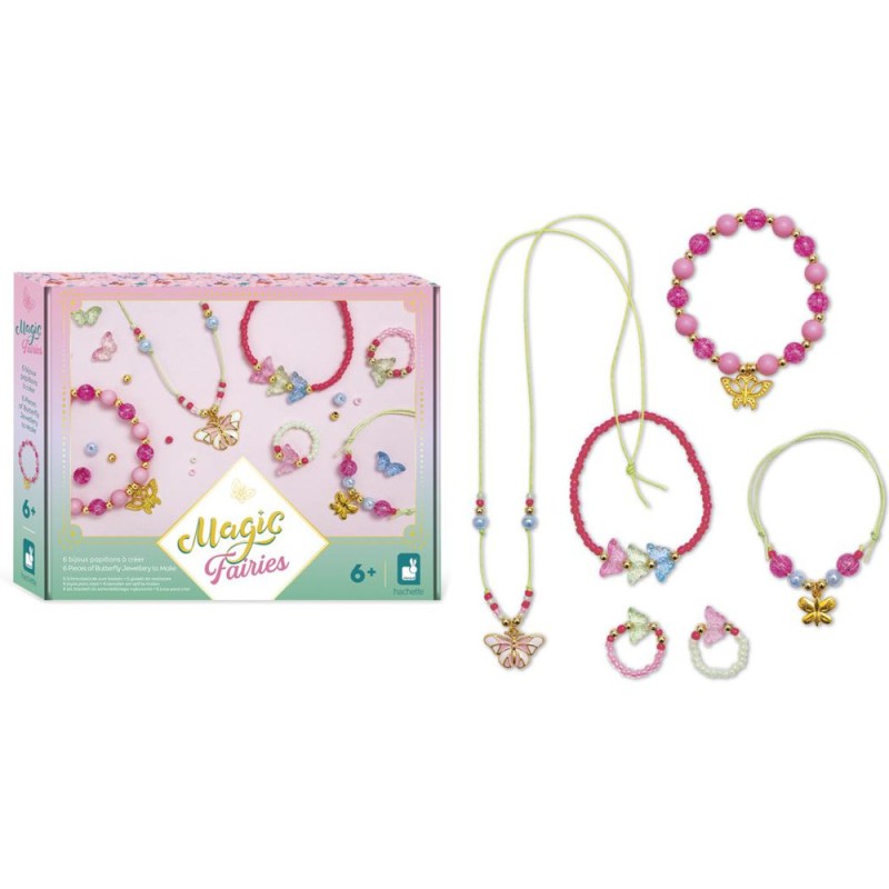 Des bijoux féériques ! Avec ce kit créatif, les enfants à partir de 6 ans réalisent 6 bijoux papillons. Un atelier création de bijoux, c’est idéal pour développer sa créativité et sa dextérité, mais aussi pour affirmer son style ! Porter ses propres créations ou les offrir, cela renforce la confiance en soi. Pour mener à bien leur atelier bijoux, les enfants disposent de tout le nécessaire dans le coffret : 5 perles papillons, 3 breloques papillons, 32 perles dorées, 9 perles fuchsia, 8 perles roses, 140 perles de rocaille, 4 perles bleues, du fil vert, du fil élastique, et 1 livret avec modèles et instructions. Étape par étape, les enfants créent ainsi 1 collier, 3 bracelets et 2 bagues. En voilà une jolie parure ! Avec ses bijoux papillons, votre enfant complète son look du jour ou encore ses déguisements, pour toujours arborer une touche de féérie, le tout grâce à un chouette loisir créatif. Les couleurs tendres et les perles nacrées sont du plus bel effet ! Découvrez l'univers de la collection "Magic Fairies", des kits de loisirs créatifs et d’ateliers déco pour enfant sur le thème des fées, dans un style doux et floral. Pour des après-midis créatifs qui font rêver !